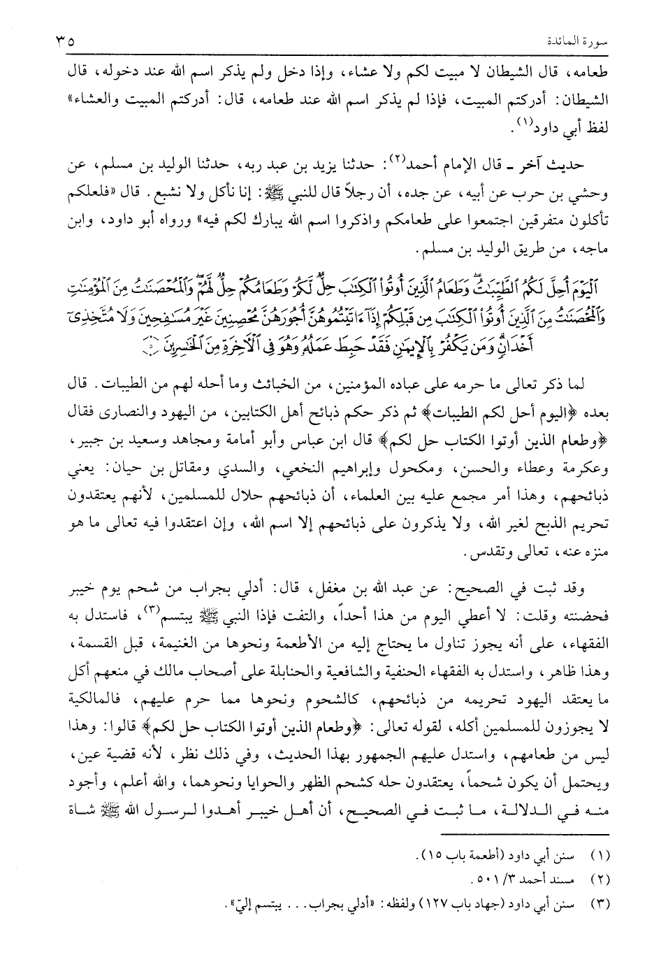 لَمَّا ذَكَرَ تَعَالَى مَا حَرَّمَهُ عَلَى عِبَادِهِ الْمُؤْمِنِينَ، مِنَ الْخَبَائِثِ وَمَا أَحَلَّهُ لَهُمْ مِنَ الطَّيِّبَاتِ. قَالَ بَعْدَهُ الْيَوْمَ أُحِلَّ لَكُمُ الطَّيِّباتُ ثُمَّ ذَكَرَ حُكْمَ ذَبَائِحِ أَهْلِ الْكِتَابَيْنِ، مِنَ الْيَهُودِ وَالنَّصَارَى فَقَالَ وَطَعامُ الَّذِينَ أُوتُوا الْكِتابَ حِلٌّ لَكُمْ قَالَ ابْنُ عَبَّاسٍ وَأَبُو أُمَامَةَ وَمُجَاهِدٌ وَسَعِيدُ بْنُ جُبَيْرٍ، وَعِكْرِمَةُ وَعَطَاءٌ وَالْحَسَنُ، وَمَكْحُولٌ وَإِبْرَاهِيمُ النَّخَعِيُّ، والسُّدِّيُّ وَمُقَاتِلُ بْنُ حَيَّانَ: يَعْنِي ذَبَائِحَهُمْ، وَهَذَا أَمْرٌ مُجْمَعٌ عَلَيْهِ بَيْنَ الْعُلَمَاءِ، أَنَّ ذَبَائِحَهُمْ حَلَالٌ لِلْمُسْلِمِينَ، لِأَنَّهُمْ يَعْتَقِدُونَ تَحْرِيمَ الذَّبْحِ لِغَيْرِ اللَّهِ، وَلَا يَذْكُرُونَ عَلَى ذَبَائِحِهِمْ إِلَّا اسْمَ اللَّهِ، وَإِنِ اعْتَقَدُوا فِيهِ تعالى ما هو منزه عنه، تَعَالَى وَتَقَدَّسَ.