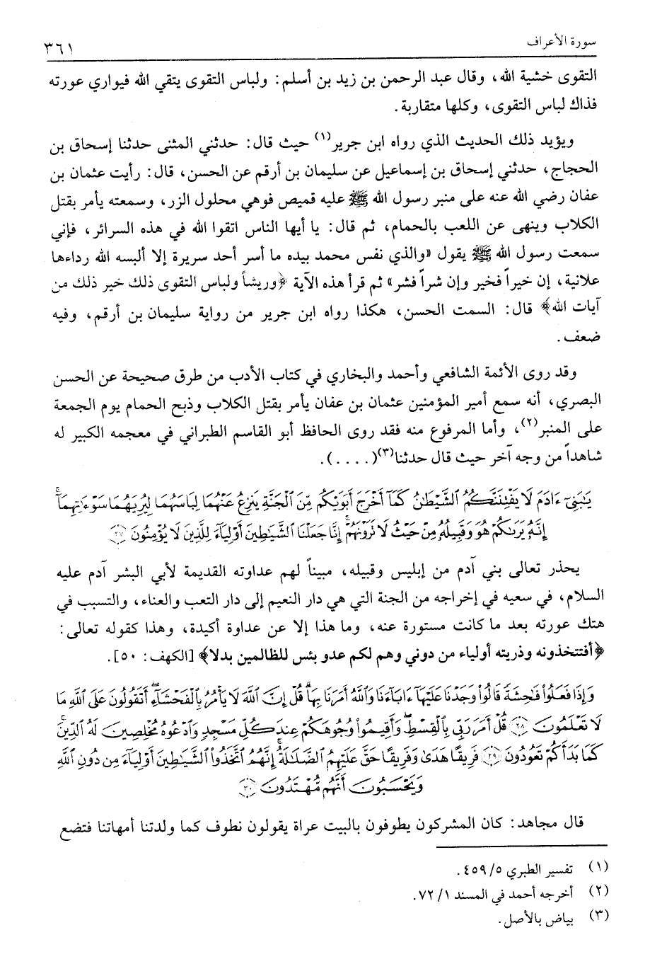 وَيُؤَيِّدُ ذَلِكَ الْحَدِيثُ الَّذِي رَوَاهُ ابْنُ جَرِيرٍ «1» حَيْثُ قَالَ: حَدَّثَنِي الْمُثَنَّى حَدَّثَنَا إِسْحَاقُ بن الحجاج، حدثني إِسْحَاقُ بْنُ إِسْمَاعِيلَ عَنْ سُلَيْمَانَ بْنِ أَرْقَمَ عَنِ الْحَسَنِ، قَالَ: رَأَيْتُ عُثْمَانَ بْنَ عَفَّانَ رَضِيَ اللَّهُ عَنْهُ عَلَى مِنْبَرِ رَسُولِ اللَّهِ صَلَّى اللَّهُ عَلَيْهِ وسلّم عليه قميص فوهي مَحْلُولُ الزِّرِّ، وَسَمِعْتُهُ يَأْمُرُ بِقَتْلِ الْكِلَابِ وَيَنْهَى عَنِ اللَّعِبِ بِالْحَمَامِ، ثُمَّ قَالَ: يَا أَيُّهَا النَّاسُ اتَّقُوا اللَّهَ فِي هَذِهِ السَّرَائِرِ، فَإِنِّي سَمِعْتُ رَسُولَ اللَّهِ صَلَّى اللَّهُ عَلَيْهِ وسلم يقول «والذي نفس محمد بيده مَا أَسَرَّ أَحَدٌ سَرِيرَةً إِلَّا أَلْبَسُهُ اللَّهُ رداءها عَلَانِيَةً، إِنْ خَيْرًا فَخَيْرٌ وَإِنْ شَرًّا فَشَرٌّ» ثُمَّ قرأ هذه الآية وَرِيشاً وَلِباسُ التَّقْوى ذلِكَ خَيْرٌ ذلِكَ مِنْ آياتِ اللَّهِ قَالَ: السَّمْتُ الْحَسَنُ، هَكَذَا رَوَاهُ ابْنُ جَرِيرٍ مِنْ رِوَايَةِ سُلَيْمَانَ بْنِ أَرْقَمَ، وَفِيهِ ضَعْفٌ.