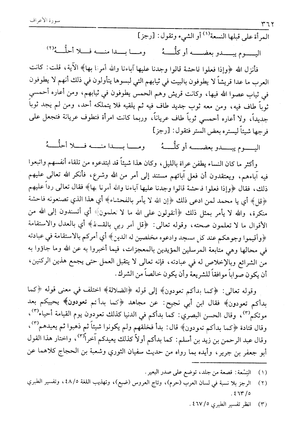 فأنزل الله وَإِذا فَعَلُوا فاحِشَةً قالُوا وَجَدْنا عَلَيْها آباءَنا وَاللَّهُ أَمَرَنا بِها الْآيَةَ، قُلْتُ: كَانَتِ الْعَرَبُ مَا عَدَا قُرَيْشًا لَا يَطُوفُونَ بِالْبَيْتِ فِي ثِيَابِهِمُ الَّتِي لَبِسُوهَا يَتَأَوَّلُونَ فِي ذَلِكَ أَنَّهُمْ لَا يَطُوفُونَ فِي ثِيَابٍ عَصَوُا اللَّهَ فِيهَا، وَكَانَتْ قُرَيْشٌ وَهُمُ الْحُمْسُ يَطُوفُونَ فِي ثِيَابِهِمْ، وَمَنْ أَعَارَهُ أَحْمَسِيٌّ ثَوْبًا طَافَ فِيهِ، وَمِنْ مَعَهُ ثَوْبٌ جَدِيدٌ طَافٍ فِيهِ ثُمَّ يُلْقِيهِ فلا يتملكه أحد، ومن لَمْ يَجِدْ ثَوْبًا جَدِيدًا، وَلَا أَعَارَهُ أَحْمَسِيٌّ ثَوْبًا طَافَ عُرْيَانًا، وَرُبَّمَا كَانَتِ امْرَأَةً فَتَطُوفُ عريانة فتجعل على فرجها شيئا ليستره بعض الستر فتقول: [رجز]