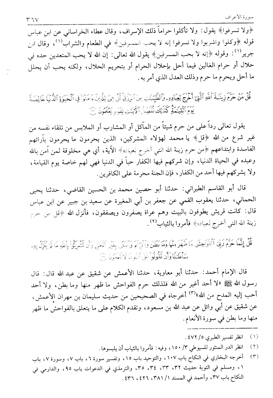 قَالَ أَبُو الْقَاسِمِ الطَّبَرَانِيُّ: حَدَّثَنَا أَبُو حُصَيْنٍ مُحَمَّدُ بْنُ الْحُسَيْنِ الْقَاضِي، حَدَّثَنَا يَحْيَى الْحِمَّانِيُّ، حَدَّثَنَا يَعْقُوبُ الْقُمِّيُّ عَنْ جَعْفَرِ بْنِ أَبِي الْمُغِيرَةِ عَنْ سَعِيدِ بْنِ جُبَيْرٍ عَنِ ابْنِ عَبَّاسٍ قَالَ: كَانَتْ قُرَيْشٌ يَطُوفُونَ بِالْبَيْتِ وَهُمْ عُرَاةٌ يُصَفِّرُونَ وَيُصَفِّقُونَ، فَأَنْزَلَ اللَّهُ قُلْ مَنْ حَرَّمَ زِينَةَ اللَّهِ الَّتِي أَخْرَجَ لِعِبادِهِ فأمروا بالثياب «2» .
