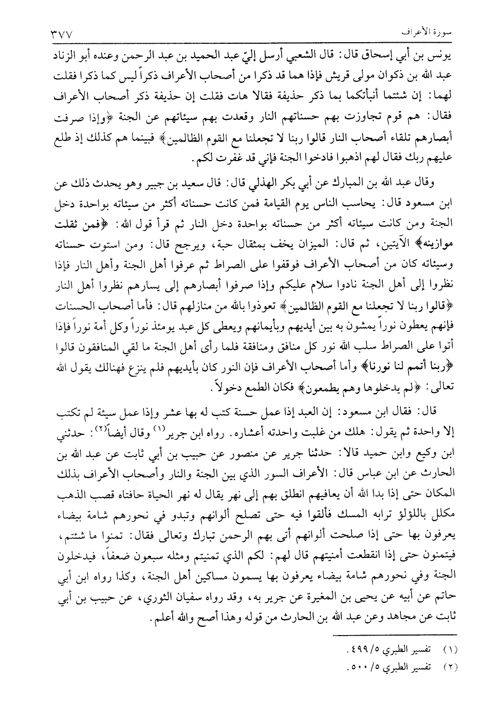 وَقَالَ عَبْدُ اللَّهِ بْنُ الْمُبَارَكِ عَنْ أَبِي بَكْرٍ الْهُذَلِيِّ قَالَ: قَالَ سَعِيدُ بْنُ جُبَيْرٍ وَهُوَ يُحَدِّثُ ذَلِكَ عَنِ ابْنِ مَسْعُودٍ قَالَ: يُحَاسَبُ النَّاسُ يَوْمَ الْقِيَامَةِ فَمَنْ كَانَتْ حَسَنَاتُهُ أَكْثَرَ مِنْ سَيِّئَاتِهِ بِوَاحِدَةٍ دَخَلَ الْجَنَّةَ وَمَنْ كَانَتْ سَيِّئَاتُهُ أَكْثَرَ مِنْ حَسَنَاتِهِ بِوَاحِدَةٍ دَخَلَ النَّارَ ثُمَّ قَرَأَ قول الله: فَمَنْ ثَقُلَتْ مَوازِينُهُ الآيتين، ثم قال: الْمِيزَانَ يَخِفُّ بِمِثْقَالِ حَبَّةٍ، وَيَرْجَحُ قَالَ: وَمَنِ اسْتَوَتْ حَسَنَاتُهُ وَسَيِّئَاتُهُ كَانَ مِنْ أَصْحَابِ الْأَعْرَافِ فَوَقَفُوا عَلَى الصِّرَاطِ ثُمَّ عَرَفُوا أَهْلَ الْجَنَّةِ وَأَهْلَ النَّارِ فَإِذَا نَظَرُوا إِلَى أَهْلِ الْجَنَّةِ نَادَوْا سَلَامٌ عَلَيْكُمْ وَإِذَا صَرَفُوا أَبْصَارَهُمْ إِلَى يسارهم نظروا أهل النَّارِ قالُوا رَبَّنا لَا تَجْعَلْنا مَعَ الْقَوْمِ الظَّالِمِينَ تعوذوا بِاللَّهِ مِنْ مَنَازِلِهِمْ قَالَ: فَأَمَّا أَصْحَابُ الْحَسَنَاتِ فإنهم يعطون نورا يمشون بِهِ بَيْنَ أَيْدِيهِمْ وَبِأَيْمَانِهِمْ وَيُعْطَى كُلُّ عَبْدٍ يَوْمَئِذٍ نُورًا وَكُلُّ أُمَّةٍ نُورًا فَإِذَا أَتَوْا عَلَى الصِّرَاطِ سَلَبَ اللَّهُ نُورَ كُلِّ مُنَافِقٍ وَمُنَافِقَةٍ فَلَمَّا رَأَى أَهْلُ الْجَنَّةِ مَا لَقِيَ المنافقون قالوا رَبَّنا أَتْمِمْ لَنا نُورَنا وأما أصحاب الأعراف فإن النور كان بأيديهم فَلَمْ يُنْزَعْ فَهُنَالِكَ يَقُولُ اللَّهُ تَعَالَى: لَمْ يَدْخُلُوها وَهُمْ يَطْمَعُونَ فَكَانَ الطَّمَعُ دُخُولًا.