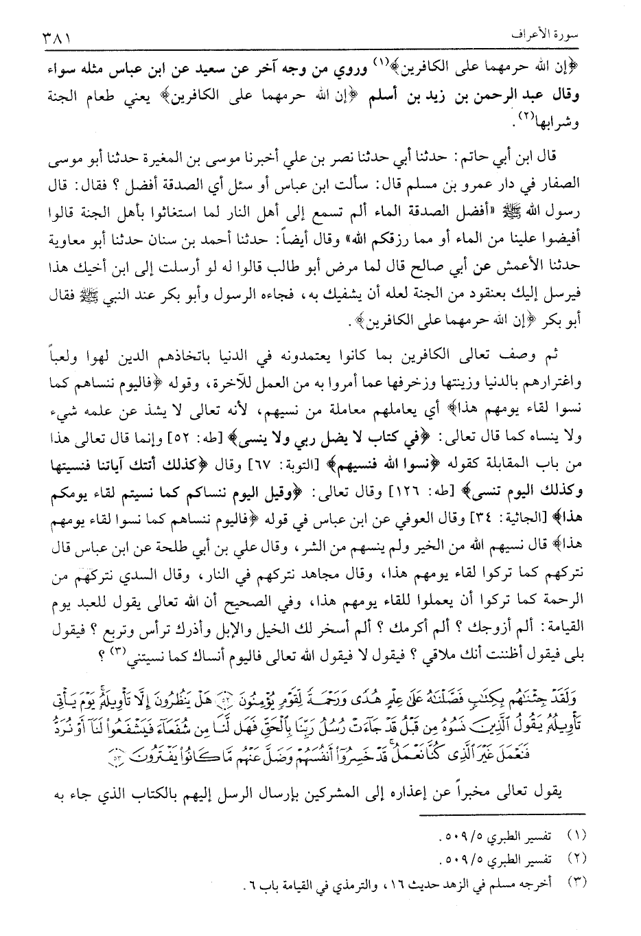 إِنَّ اللَّهَ حَرَّمَهُما عَلَى الْكافِرِينَ «1» وَرُوِيَ مِنْ وَجْهٍ آخَرَ عَنْ سَعِيدٍ عَنِ ابْنِ عَبَّاسٍ مِثْلُهُ سَوَاءً وَقَالَ عَبْدُ الرَّحْمَنِ بْنُ زَيْدِ بْنِ أَسْلَمَ إِنَّ اللَّهَ حَرَّمَهُما عَلَى الْكافِرِينَ يعني طعام الجنة وشرابها «2» .