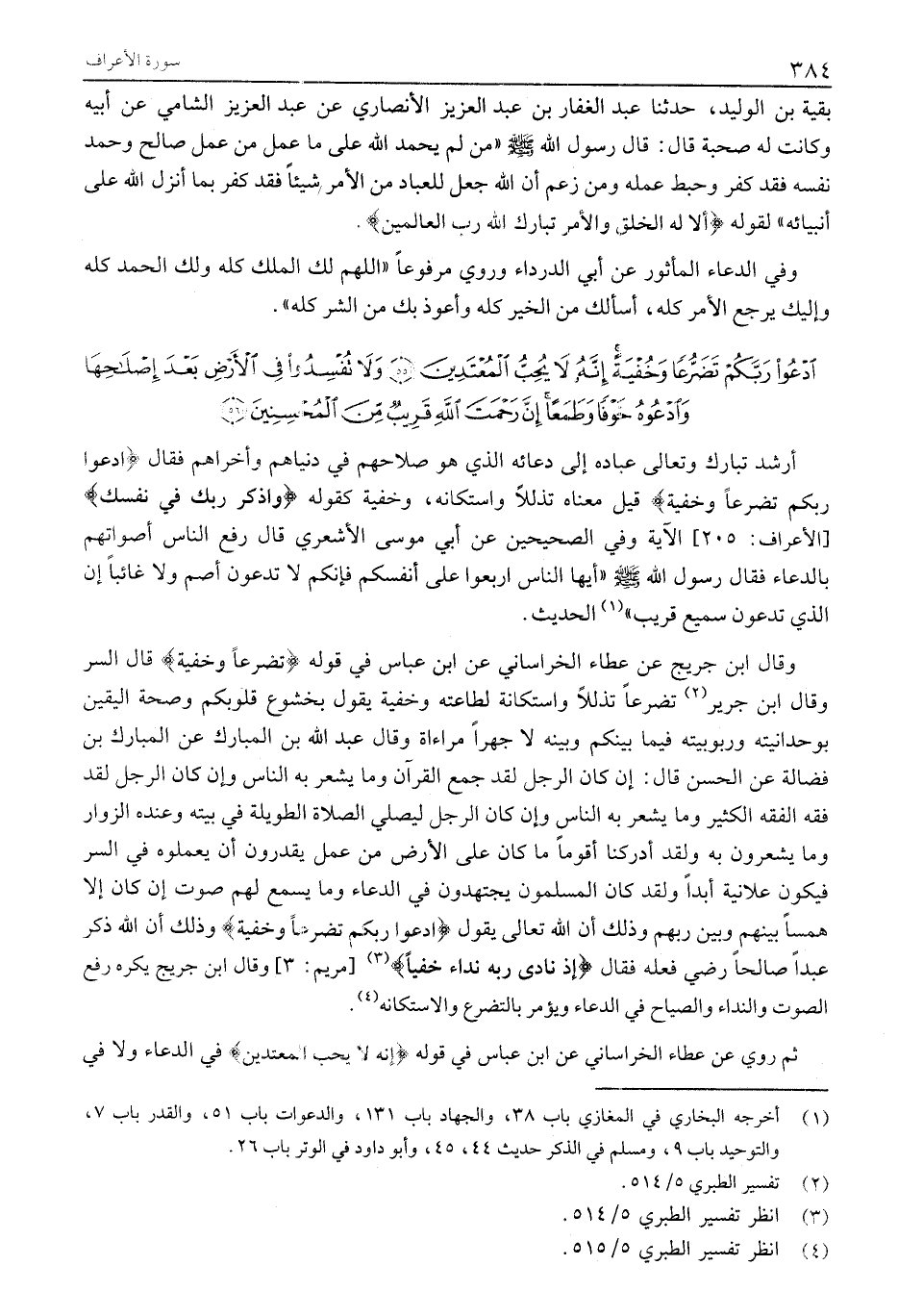وَقَالَ ابْنُ جُرَيْجٍ عَنْ عَطَاءٍ الْخُرَاسَانِيِّ عَنِ ابْنِ عَبَّاسٍ فِي قَوْلِهِ تَضَرُّعاً وَخُفْيَةً قَالَ السِّرُّ وَقَالَ ابْنُ جَرِيرٍ «2» تَضَرُّعًا تَذَلُّلًا وَاسْتِكَانَةً لِطَاعَتِهِ وَخُفْيَةً يَقُولُ بِخُشُوعِ قُلُوبِكُمْ وَصِحَّةِ الْيَقِينِ بِوَحْدَانِيَّتِهِ وَرُبُوبِيَّتِهِ فِيمَا بَيْنَكُمْ وبينه لا جهرا مراءاة وَقَالَ عَبْدُ اللَّهِ بْنُ الْمُبَارَكِ عَنِ الْمُبَارَكِ بْنِ فُضَالَةَ عَنِ الْحَسَنِ قَالَ: إِنْ كَانَ الرَّجُلُ لَقَدْ جَمَعَ الْقُرْآنَ وَمَا يَشْعُرُ بِهِ النَّاسُ وَإِنْ كَانَ الرَّجُلُ لَقَدْ فَقُهَ الْفِقْهَ الْكَثِيرَ وَمَا يَشْعُرُ بِهِ النَّاسُ وَإِنْ كَانَ الرَّجُلُ لَيُصَلِّيَ الصَّلَاةَ الطَّوِيلَةَ فِي بَيْتِهِ وَعِنْدَهُ الزوار وَمَا يَشْعُرُونَ بِهِ وَلَقَدْ أَدْرَكْنَا أَقْوَامًا مَا كَانَ عَلَى الْأَرْضِ مِنْ عَمَلٍ يَقْدِرُونَ أَنْ يَعْمَلُوهُ فِي السِّرِّ فَيَكُونُ عَلَانِيَةً أَبَدًا وَلَقَدْ كَانَ الْمُسْلِمُونَ يَجْتَهِدُونَ فِي الدُّعَاءِ وَمَا يُسْمَعُ لَهُمْ صَوْتٌ إِنْ كَانَ إِلَّا هَمْسًا بَيْنَهُمْ وَبَيْنَ رَبِّهِمْ وَذَلِكَ أَنَّ اللَّهَ تَعَالَى يَقُولُ ادْعُوا رَبَّكُمْ تَضَرُّعاً وَخُفْيَةً وَذَلِكَ أَنَّ اللَّهَ ذَكَرَ عَبْدًا صَالِحًا رَضِيَ فِعْلَهُ فَقَالَ إِذْ نَادَى رَبَّهُ نِداءً خَفِيًّا «3» [مَرْيَمَ: 3] وَقَالَ ابْنُ جُرَيْجٍ يُكْرَهُ رَفْعُ الصَّوْتِ وَالنِّدَاءُ وَالصِّيَاحُ فِي الدُّعَاءِ وَيُؤْمَرُ بِالتَّضَرُّعِ وَالِاسْتِكَانَةِ «4» .