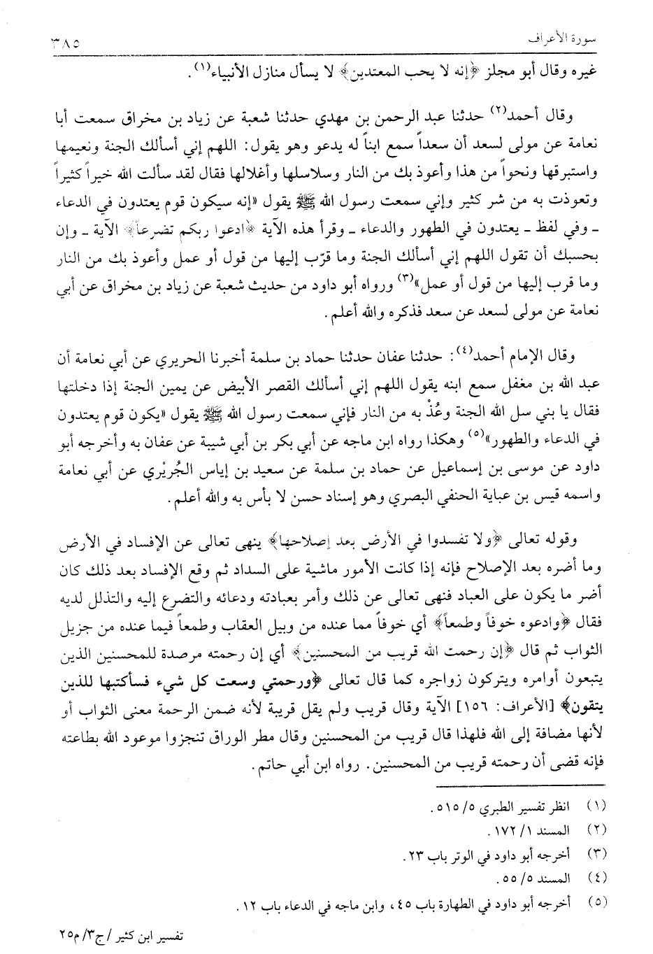 وَقَالَ أَحْمَدُ «2» حَدَّثَنَا عَبْدُ الرَّحْمَنِ بْنُ مَهْدِيٍّ حَدَّثَنَا شُعْبَةُ عَنْ زِيَادِ بْنِ مِخْرَاقٍ سَمِعْتُ أَبَا نَعَامَةَ عَنْ مَوْلًى لِسَعْدٍ أَنَّ سَعْدًا سَمِعَ ابْنًا لَهُ يَدْعُو وَهُوَ يَقُولُ: اللَّهُمَّ إِنِّي أَسْأَلُكَ الْجَنَّةَ وَنَعِيمَهَا وَإِسْتَبْرَقَهَا وَنَحْوًا مِنْ هَذَا وَأَعُوذُ بِكَ مِنَ النَّارِ وَسَلَاسِلِهَا وَأَغْلَالِهَا فَقَالَ لَقَدْ سَأَلْتَ اللَّهَ خَيْرًا كَثِيرًا وَتَعَوَّذْتَ به مِنْ شَرٍّ كَثِيرٍ وَإِنِّي سَمِعْتُ رَسُولَ اللَّهِ صَلَّى اللَّهُ عَلَيْهِ وَسَلَّمَ يَقُولُ «إِنَّهُ سَيَكُونُ قوم يعتدون في الدعاء- وفي لفظ- يعتدون في الطهور والدعاء- وقرأ هذه الآية ادْعُوا رَبَّكُمْ تَضَرُّعاً الآية- وَإِنَّ بِحَسْبِكَ أَنْ تَقُولَ اللَّهُمَّ إِنِّي أَسْأَلُكَ الْجَنَّةَ وَمَا قَرَّبَ إِلَيْهَا مِنْ قَوْلٍ أَوْ عَمَلٍ وَأَعُوذُ بِكَ مِنَ النَّارِ وَمَا قَرَّبَ إِلَيْهَا مِنْ قَوْلٍ أَوْ عَمَلٍ» «3» وَرَوَاهُ أَبُو دَاوُدَ مِنْ حَدِيثِ شُعْبَةَ عَنْ زِيَادِ بْنِ مخراق عن أبي نعامة عن مولى لِسَعْدٍ عَنْ سَعْدٍ فَذَكَرَهُ وَاللَّهُ أَعْلَمُ.