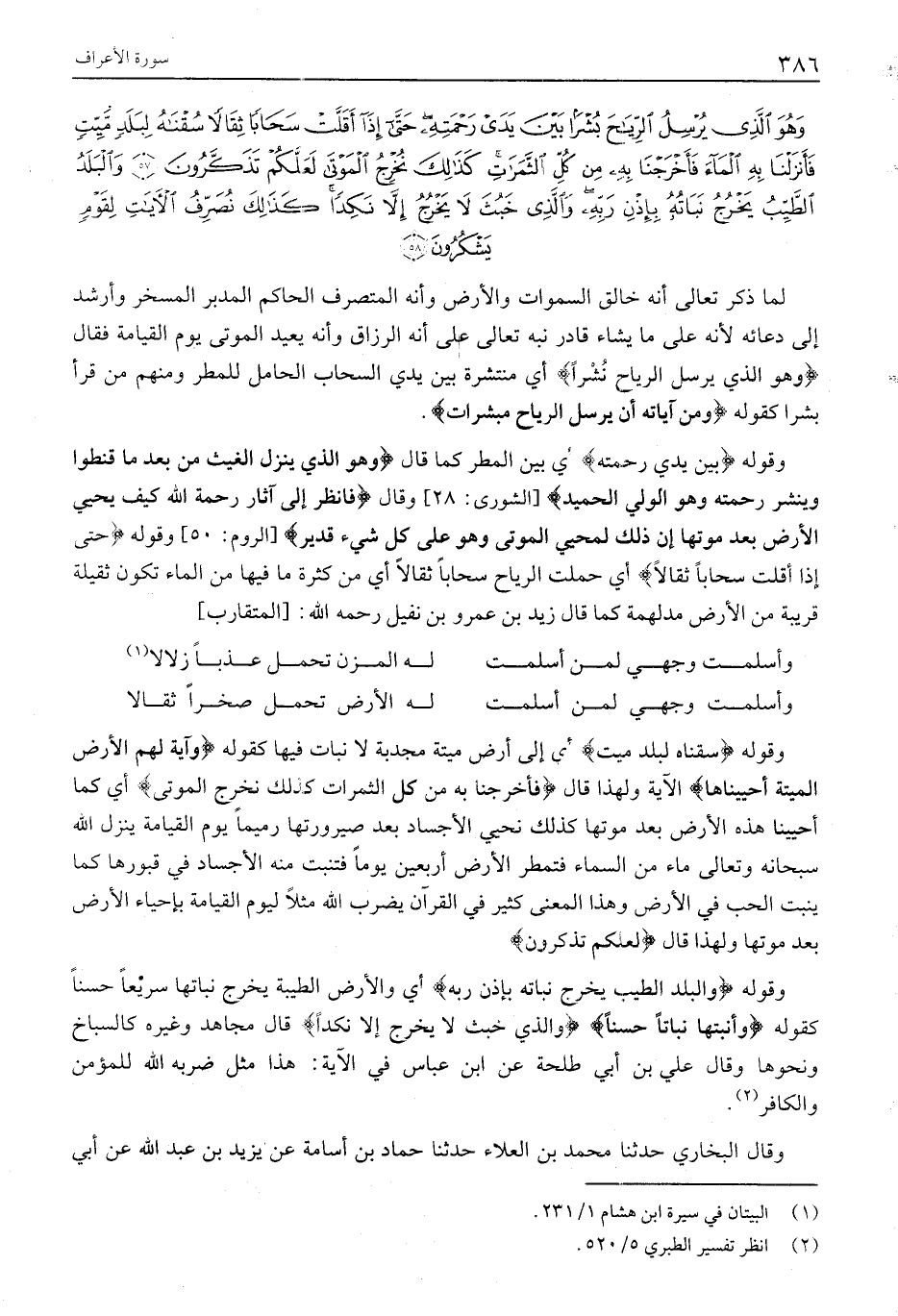 وَهُوَ الَّذِي يُرْسِلُ الرِّياحَ بُشْراً بَيْنَ يَدَيْ رَحْمَتِهِ حَتَّى إِذا أَقَلَّتْ سَحاباً ثِقالاً سُقْناهُ لِبَلَدٍ مَيِّتٍ فَأَنْزَلْنا بِهِ الْماءَ فَأَخْرَجْنا بِهِ مِنْ كُلِّ الثَّمَراتِ كَذلِكَ نُخْرِجُ الْمَوْتى لَعَلَّكُمْ تَذَكَّرُونَ (57) وَالْبَلَدُ الطَّيِّبُ يَخْرُجُ نَباتُهُ بِإِذْنِ رَبِّهِ وَالَّذِي خَبُثَ لَا يَخْرُجُ إِلاَّ نَكِداً كَذلِكَ نُصَرِّفُ الْآياتِ لِقَوْمٍ يَشْكُرُونَ (58)