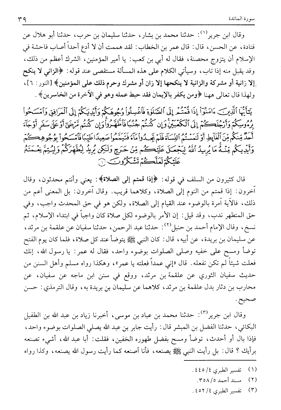 قَالَ كَثِيرُونَ من السلف في قوله: إِذا قُمْتُمْ إِلَى الصَّلاةِ: يعني وَأَنْتُمْ مُحْدِثُونَ، وَقَالَ آخَرُونَ: إِذَا قُمْتُمْ مِنَ النَّوْمِ إِلَى الصَّلَاةِ، وَكِلَاهُمَا قَرِيبٌ. وَقَالَ آخَرُونَ: بَلِ الْمَعْنَى أَعَمُّ مِنْ ذَلِكَ، فَالْآيَةُ آمِرَةٌ بِالْوُضُوءِ عِنْدَ الْقِيَامِ إِلَى الصَّلَاةِ، وَلَكِنْ هُوَ في حق المحدث واجب، وفي حق المتطهر ندب، وَقَدْ قِيلَ: إِنَّ الْأَمْرَ بِالْوُضُوءِ لِكُلِّ صَلَاةٍ كَانَ وَاجِبًا فِي ابْتِدَاءِ الْإِسْلَامِ، ثُمَّ نُسِخَ، وقال الْإِمَامُ أَحْمَدُ بْنُ حَنْبَلٍ «2» : حَدَّثَنَا عَبْدُ الرَّحْمَنِ، حَدَّثَنَا سُفْيَانُ عَنْ عَلْقَمَةَ بْنِ مَرْثَدٍ، عَنْ سُلَيْمَانَ بْنِ بُرَيْدَةَ، عَنْ أَبِيهِ، قَالَ: كَانَ النَّبِيُّ صَلَّى اللَّهُ عَلَيْهِ وَسَلَّمَ يَتَوَضَّأُ عِنْدَ كُلِّ صَلَاةٍ، فَلَمَّا كَانَ يَوْمُ الْفَتْحِ تَوَضَّأَ وَمَسَحَ عَلَى خُفَّيْهِ وَصَلَّى الصَّلَوَاتِ بِوُضُوءٍ وَاحِدٍ، فَقَالَ لَهُ عُمَرُ: يَا رَسُولَ اللَّهِ، إِنَّكَ فَعَلْتَ شَيْئًا لَمْ تَكُنْ تَفْعَلُهُ. قَالَ «إِنِّي عَمْدًا فَعَلْتُهُ يَا عُمَرُ» ، وَهَكَذَا رَوَاهُ مُسْلِمٌ وَأَهْلُ السُّنَنِ مِنْ حَدِيثِ سُفْيَانَ الثَّوْرِيِّ عَنْ عَلْقَمَةَ بْنِ مَرْثَدٍ، وَوَقَعَ فِي سُنَنِ ابْنِ مَاجَهْ عَنْ سُفْيَانَ، عَنْ مُحَارِبِ بْنِ دِثَارٍ بَدَلَ عَلْقَمَةَ بْنِ مَرْثَدٍ، كِلَاهُمَا عَنْ سُلَيْمَانَ بْنِ بُرَيْدَةَ بِهِ، وَقَالَ التِّرْمِذِيُّ: حَسَنٌ صَحِيحٌ.