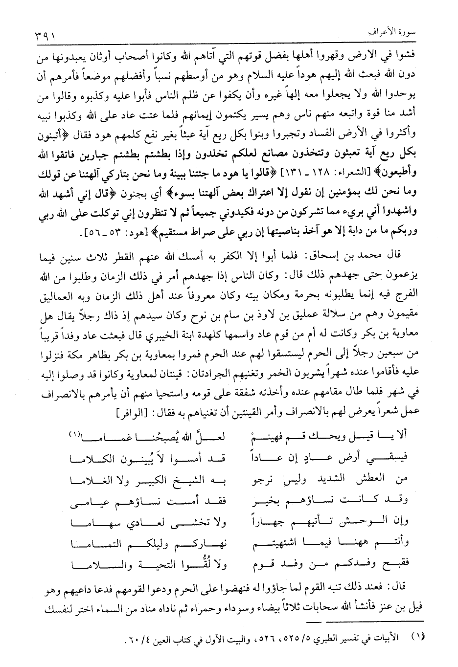 قَالَ مُحَمَّدُ بْنُ إِسْحَاقَ: فَلَمَّا أَبَوْا إِلَّا الْكُفْرَ بِهِ أَمْسَكَ اللَّهُ عَنْهُمُ الْقَطْرَ ثَلَاثَ سِنِينَ فِيمَا يَزْعُمُونَ حَتَّى جَهَدَهُمْ ذَلِكَ قَالَ: وَكَانَ النَّاسُ إِذَا جَهَدَهُمْ أَمْرٌ فِي ذلك الزمان وطلبوا مِنَ اللَّهِ الْفَرَجَ فِيهِ إِنَّمَا يَطْلُبُونَهُ بِحُرْمَةِ ومكان بيته وكان معروفا عند أهل ذلك الزمان وَبِهِ الْعَمَالِيقُ مُقِيمُونَ وَهُمْ مِنْ سُلَالَةِ عِمْلِيقَ بْنِ لَاوِذَ بْنِ سَامَ بْنِ نُوحٍ وَكَانَ سيدهم إذ ذاك رجلا يقال هل مُعَاوِيَةُ بْنُ بَكْرٍ وَكَانَتْ لَهُ أُمٌّ مِنْ قَوْمِ عَادٍ وَاسْمُهَا كَلْهَدَةُ ابْنَةُ الْخَيْبَرِيِّ قَالَ فَبَعَثَتْ عَادٌ وَفْدًا قَرِيبًا مِنْ سَبْعِينَ رَجُلًا إِلَى الْحَرَمِ لِيَسْتَسْقُوا لَهُمْ عِنْدَ الْحَرَمِ فَمَرُّوا بِمُعَاوِيَةَ بْنِ بَكْرٍ بِظَاهِرِ مَكَّةَ فَنَزَلُوا عَلَيْهِ فَأَقَامُوا عِنْدَهُ شَهْرًا يَشْرَبُونَ الْخَمْرَ وَتُغَنِّيهُمُ الْجَرَادَتَانِ: قَيْنَتَانِ لِمُعَاوِيَةَ وَكَانُوا قَدْ وَصَلُوا إِلَيْهِ فِي شَهْرٍ فَلَمَّا طَالَ مُقَامُهُمْ عِنْدَهُ وَأَخَذَتْهُ شَفَقَةٌ عَلَى قَوْمِهِ وَاسْتَحْيَا مِنْهُمْ أَنْ يَأْمُرَهُمْ بِالِانْصِرَافِ عَمِلَ شِعْرًا يَعْرِضُ لَهُمْ بِالِانْصِرَافِ وَأَمَرَ الْقَيْنَتَيْنِ أن تغنياهم به فقال: [الوافر]