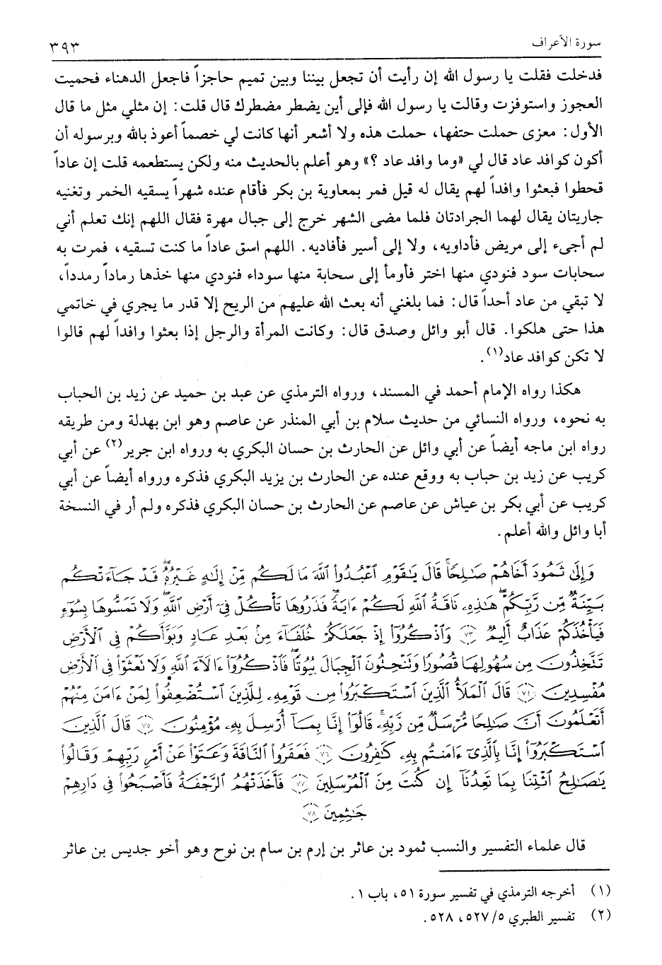 وَإِلى ثَمُودَ أَخاهُمْ صالِحاً قالَ يَا قَوْمِ اعْبُدُوا اللَّهَ مَا لَكُمْ مِنْ إِلهٍ غَيْرُهُ قَدْ جاءَتْكُمْ بَيِّنَةٌ مِنْ رَبِّكُمْ هذِهِ ناقَةُ اللَّهِ لَكُمْ آيَةً فَذَرُوها تَأْكُلْ فِي أَرْضِ اللَّهِ وَلا تَمَسُّوها بِسُوءٍ فَيَأْخُذَكُمْ عَذابٌ أَلِيمٌ (73) وَاذْكُرُوا إِذْ جَعَلَكُمْ خُلَفاءَ مِنْ بَعْدِ عادٍ وَبَوَّأَكُمْ فِي الْأَرْضِ تَتَّخِذُونَ مِنْ سُهُولِها قُصُوراً وَتَنْحِتُونَ الْجِبالَ بُيُوتاً فَاذْكُرُوا آلاءَ اللَّهِ وَلا تَعْثَوْا فِي الْأَرْضِ مُفْسِدِينَ (74) قالَ الْمَلَأُ الَّذِينَ اسْتَكْبَرُوا مِنْ قَوْمِهِ لِلَّذِينَ اسْتُضْعِفُوا لِمَنْ آمَنَ مِنْهُمْ أَتَعْلَمُونَ أَنَّ صالِحاً مُرْسَلٌ مِنْ رَبِّهِ قالُوا إِنَّا بِما أُرْسِلَ بِهِ مُؤْمِنُونَ (75) قالَ الَّذِينَ اسْتَكْبَرُوا إِنَّا بِالَّذِي آمَنْتُمْ بِهِ كافِرُونَ (76) فَعَقَرُوا النَّاقَةَ وَعَتَوْا عَنْ أَمْرِ رَبِّهِمْ وَقالُوا يَا صالِحُ ائْتِنا بِما تَعِدُنا إِنْ كُنْتَ مِنَ الْمُرْسَلِينَ (77)