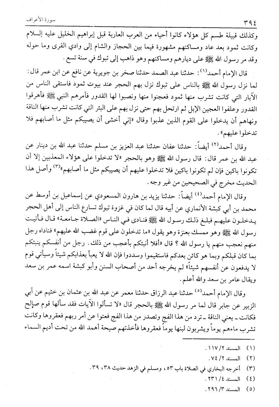 وقال أَحْمَدُ «2» أَيْضًا: حَدَّثَنَا عَفَّانُ حَدَّثَنَا عَبْدُ الْعَزِيزِ بْنُ مُسْلِمٍ حَدَّثَنَا عَبْدُ اللَّهِ بْنُ دِينَارٍ عَنْ عَبْدِ اللَّهِ بْنِ عُمَرَ قَالَ: قَالَ رَسُولُ اللَّهِ صَلَّى اللَّهُ عليه وسلم وهو بِالْحِجْرِ «لَا تَدْخُلُوا عَلَى هَؤُلَاءِ الْمُعَذَّبِينَ إِلَّا أَنْ تَكُونُوا بَاكِينَ فَإِنْ لَمْ تَكُونُوا بَاكِينَ فَلَا تَدْخُلُوا عَلَيْهِمْ أَنْ يُصِيبَكُمْ مِثْلُ مَا أَصَابَهُمْ» «3» وَأَصْلُ هَذَا الْحَدِيثِ مُخَرَّجٌ فِي الصَّحِيحَيْنِ مِنْ غَيْرِ وَجْهٍ.