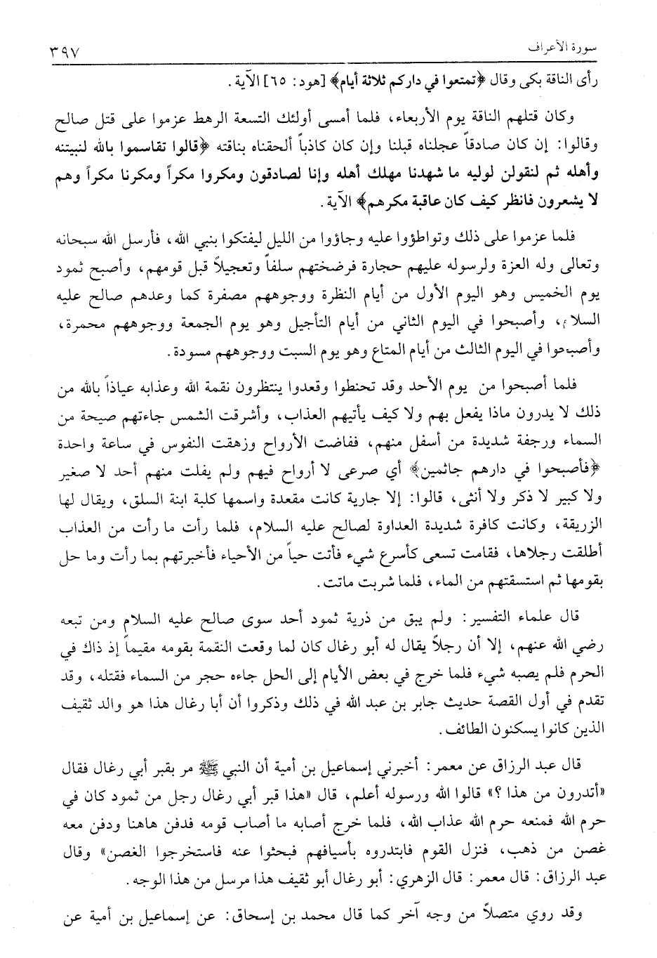 قال عبد الرزاق عن مَعْمَرٌ: أَخْبَرَنِي إِسْمَاعِيلُ بْنُ أُمَيَّةَ أَنَّ النَّبِيَّ صَلَّى اللَّهُ عَلَيْهِ وَسَلَّمَ مَرَّ بِقَبْرِ أَبِي رغال فقال «أتدرون مَنْ هَذَا؟» قَالُوا اللَّهُ وَرَسُولُهُ أَعْلَمُ، قَالَ «هَذَا قَبْرُ أَبِي رِغَالٍ رَجُلٍ مِنْ ثَمُودَ كَانَ فِي حَرَمِ اللَّهِ فَمَنَعَهُ حَرَمُ اللَّهِ عَذَابَ اللَّهِ، فَلَمَّا خَرَجَ أَصَابَهُ مَا أَصَابَ قَوْمَهُ فَدُفِنَ هَاهُنَا وَدُفِنَ مَعَهُ غُصْنٌ مِنْ ذَهَبٍ، فَنَزَلَ الْقَوْمُ فَابْتَدَرُوهُ بِأَسْيَافِهِمْ فَبَحَثُوا عَنْهُ فَاسْتَخْرَجُوا الْغُصْنَ» وَقَالَ عَبْدُ الرَّزَّاقِ: قَالَ مَعْمَرٌ: قَالَ الزُّهْرِيُّ: أَبُو رِغَالٍ أَبُو ثَقِيفٍ هَذَا مُرْسَلٌ مِنْ هَذَا الْوَجْهِ.