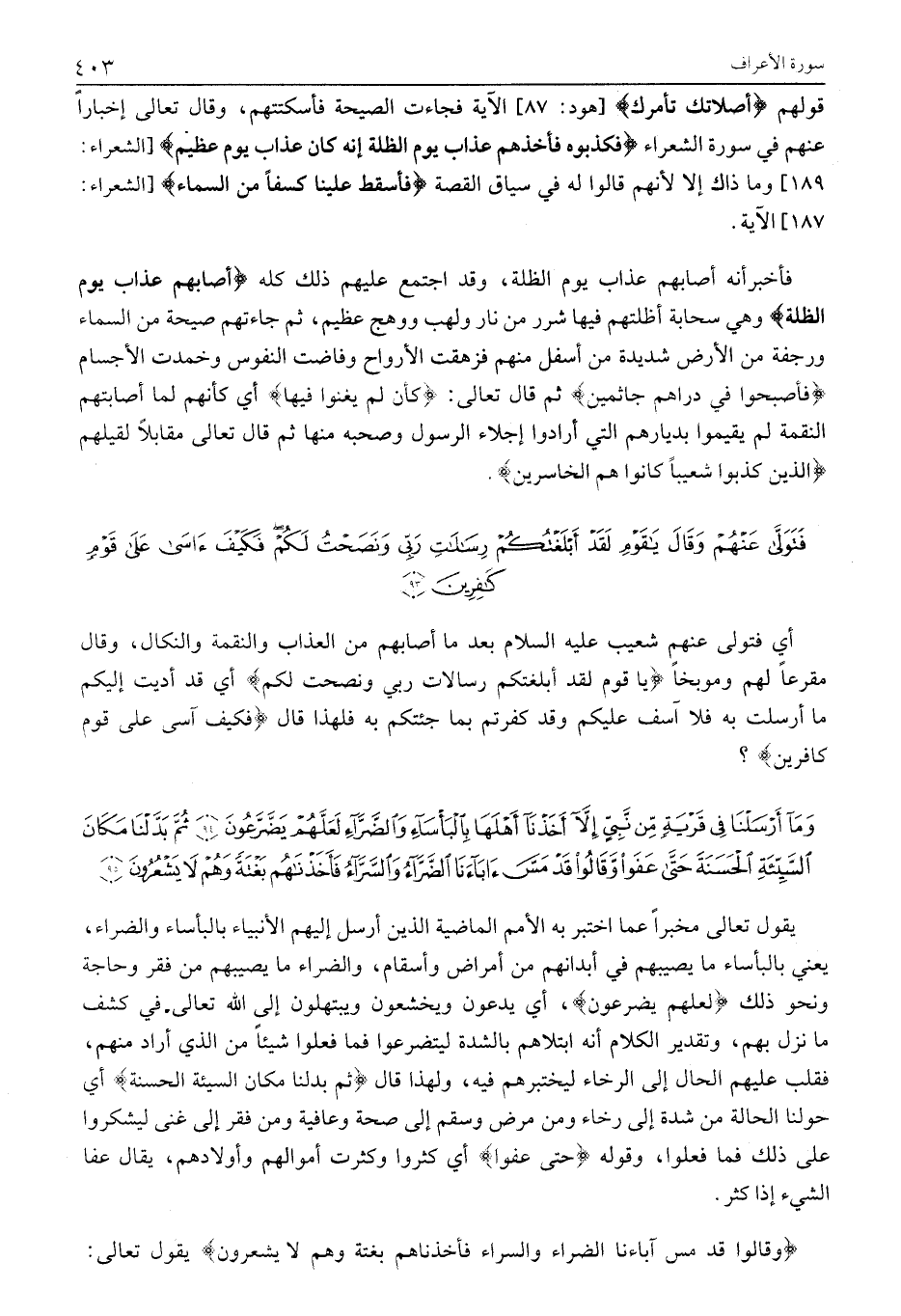قولهم أَصَلاتُكَ تَأْمُرُكَ [هود: 87] الآية فَجَاءَتِ الصَّيْحَةُ فَأَسْكَتَتْهُمْ، وَقَالَ تَعَالَى إِخْبَارًا عَنْهُمْ فِي سُورَةِ الشُّعَرَاءِ فَكَذَّبُوهُ فَأَخَذَهُمْ عَذابُ يَوْمِ الظُّلَّةِ إِنَّهُ كانَ عَذابَ يَوْمٍ عَظِيمٍ [الشُّعَرَاءِ: