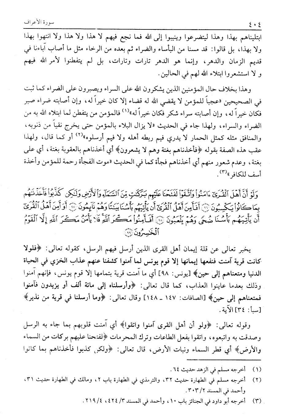 وَلَوْ أَنَّ أَهْلَ الْقُرى آمَنُوا وَاتَّقَوْا لَفَتَحْنا عَلَيْهِمْ بَرَكاتٍ مِنَ السَّماءِ وَالْأَرْضِ وَلكِنْ كَذَّبُوا فَأَخَذْناهُمْ بِما كانُوا يَكْسِبُونَ (96) أَفَأَمِنَ أَهْلُ الْقُرى أَنْ يَأْتِيَهُمْ بَأْسُنا بَياتاً وَهُمْ نائِمُونَ (97) أَوَأَمِنَ أَهْلُ الْقُرى أَنْ يَأْتِيَهُمْ بَأْسُنا ضُحًى وَهُمْ يَلْعَبُونَ (98) أَفَأَمِنُوا مَكْرَ اللَّهِ فَلا يَأْمَنُ مَكْرَ اللَّهِ إِلاَّ الْقَوْمُ الْخاسِرُونَ (99)