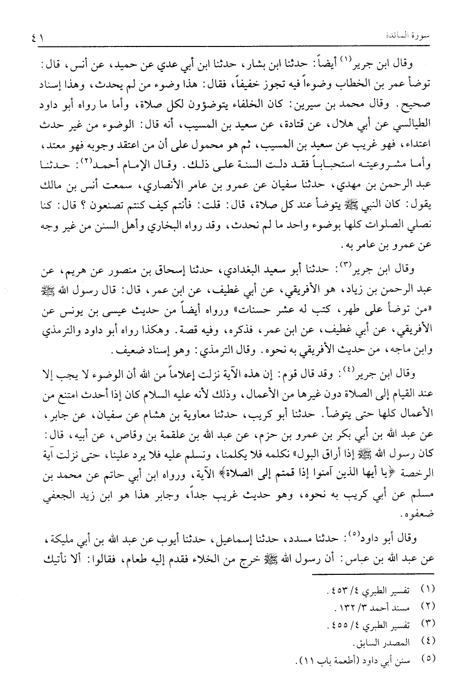 تَوَضَّأَ عُمَرُ بْنُ الْخَطَّابِ وَضَوْءًا فِيهِ تَجَوَّزَ خَفِيفًا، فَقَالَ: هَذَا وُضُوءُ مَنْ لَمْ يُحْدِثْ، وَهَذَا إِسْنَادٌ صَحِيحٌ. وَقَالَ مُحَمَّدُ بن سيرين: كان الخلفاء يتوضؤون لِكُلِّ صَلَاةٍ، وَأَمَّا مَا رَوَاهُ أَبُو دَاوُدَ الطَّيَالِسِيُّ عَنْ أَبِي هِلَالٍ، عَنْ قَتَادَةُ، عَنْ سَعِيدِ بْنِ الْمُسَيَّبِ، أَنَّهُ قَالَ: الْوُضُوءُ مِنْ غَيْرِ حَدَثٍ اعْتِدَاءٌ، فَهُوَ غَرِيبٌ عَنْ سَعِيدِ بْنِ الْمُسَيَّبِ، ثُمَّ هُوَ مَحْمُولٌ عَلَى أَنَّ مَنِ اعْتَقَدَ وَجُوبَهَ فَهُوَ مُعْتَدٍ، وَأَمَّا مَشْرُوعِيَّتُهُ اسْتِحْبَابًا فَقَدْ دَلَّتِ السُّنَّةُ عَلَى ذَلِكَ. وَقَالَ الْإِمَامُ أَحْمَدُ «2» : حَدَّثَنَا عَبْدُ الرَّحْمَنِ بْنُ مَهْدِيٍّ، حَدَّثَنَا سُفْيَانُ عَنْ عَمْرِو بْنِ عَامِرٍ الْأَنْصَارِيِّ، سَمِعْتُ أَنَسَ بْنَ مَالِكٍ يَقُولُ: كَانَ النَّبِيُّ صَلَّى اللَّهُ عَلَيْهِ وَسَلَّمَ يَتَوَضَّأُ عِنْدَ كُلِّ صَلَاةٍ، قَالَ: قُلْتُ: فَأَنْتُمْ كَيْفَ كُنْتُمْ تَصْنَعُونَ؟ قال: كنا نصلي الصلوات كلها بِوُضُوءٍ وَاحِدٍ مَا لَمْ نُحْدِثْ، وَقَدْ رَوَاهُ الْبُخَارِيُّ وَأَهْلُ السُّنَنِ مِنْ غَيْرِ وَجْهٍ عَنْ عَمْرِو بْنِ عَامِرٍ بِهِ.