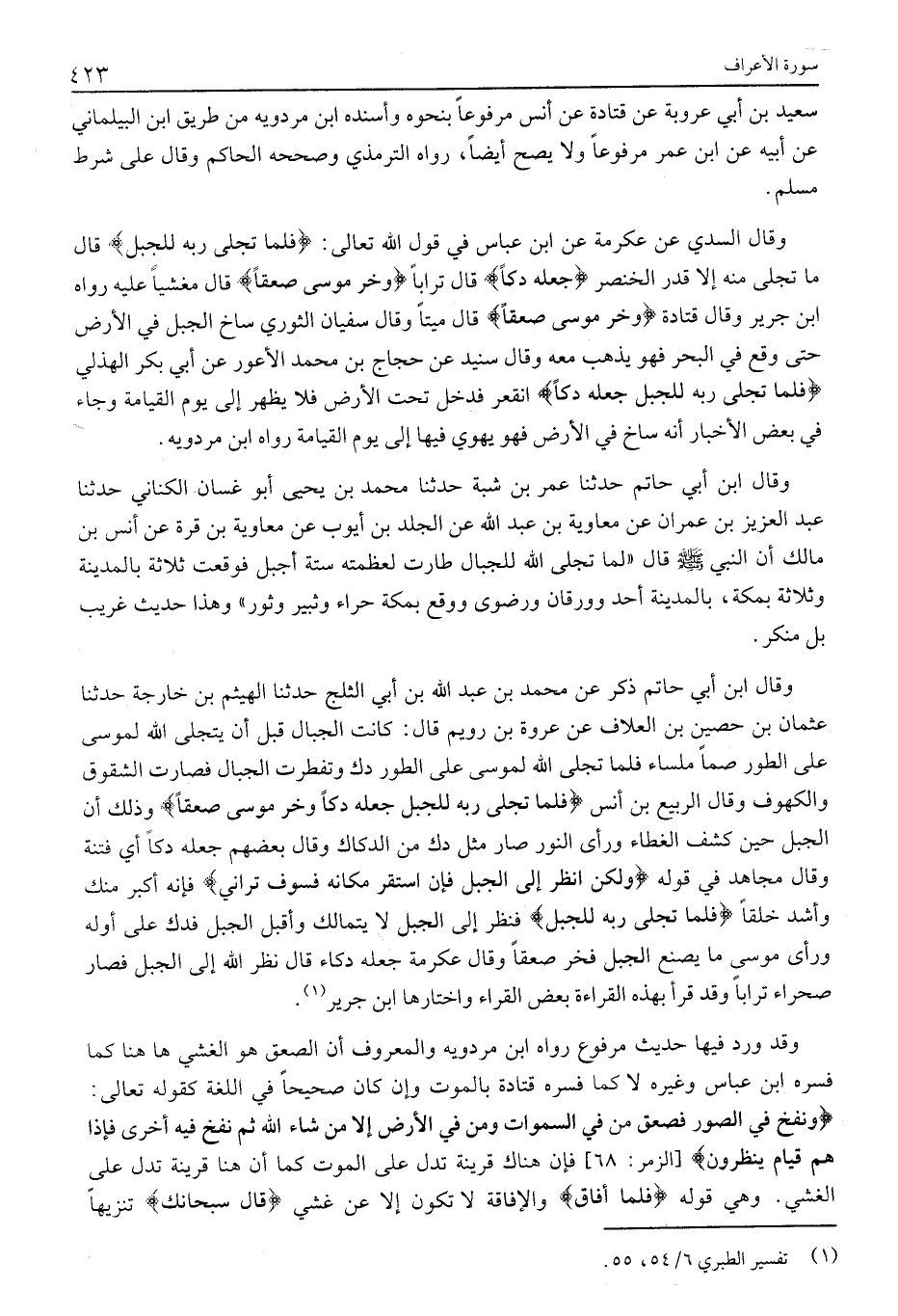 وَقَالَ السُّدِّيِّ عَنْ عِكْرِمَةَ عَنِ ابْنِ عَبَّاسٍ فِي قَوْلِ اللَّهِ تَعَالَى: فَلَمَّا تَجَلَّى رَبُّهُ لِلْجَبَلِ قَالَ مَا تَجَلَّى مِنْهُ إِلَّا قَدْرُ الْخِنْصَرِ جَعَلَهُ دَكًّا قَالَ تُرَابًا وَخَرَّ مُوسى صَعِقاً قَالَ مَغْشِيًا عَلَيْهِ رَوَاهُ ابْنُ جَرِيرٍ وَقَالَ قَتَادَةُ وَخَرَّ مُوسى صَعِقاً قَالَ مَيِّتًا وَقَالَ سُفْيَانُ الثَّوْرِيُّ سَاخَ الْجَبَلُ فِي الْأَرْضِ حَتَّى وَقَعَ فِي الْبَحْرِ فَهُوَ يَذْهَبُ مَعَهُ وَقَالَ سُنَيْدٌ عَنْ حَجَّاجِ بْنِ مُحَمَّدٍ الْأَعْوَرِ عَنْ أَبِي بَكْرٍ الْهُذَلِيِّ فَلَمَّا تَجَلَّى رَبُّهُ لِلْجَبَلِ جَعَلَهُ دَكًّا انْقَعَرَ فَدَخَلَ تَحْتَ الْأَرْضِ فَلَا يَظْهَرُ إِلَى يَوْمِ الْقِيَامَةِ وَجَاءَ فِي بَعْضِ الْأَخْبَارِ أَنَّهُ سَاخَ فِي الْأَرْضِ فَهُوَ يَهْوِي فِيهَا إِلَى يَوْمِ الْقِيَامَةِ رَوَاهُ ابْنُ مَرْدَوَيْهِ.