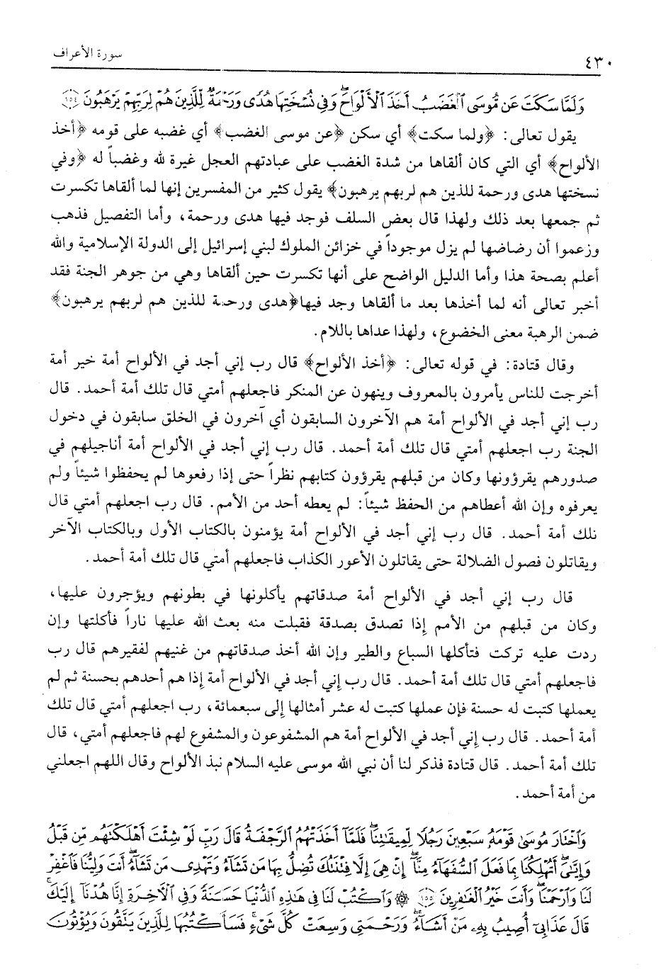 وَقَالَ قَتَادَةُ: فِي قَوْلِهِ تَعَالَى: أَخَذَ الْأَلْواحَ قَالَ رَبِّ إِنِّي أَجِدُ فِي الْأَلْوَاحِ أُمَّةً خَيْرَ أُمَّةٍ أُخْرِجَتْ لِلنَّاسِ يَأْمُرُونَ بِالْمَعْرُوفِ وَيَنْهَوْنَ عَنِ الْمُنْكَرِ فَاجْعَلْهُمْ أُمَّتِي قَالَ تِلْكَ أُمَّةُ أَحْمَدَ. قَالَ رَبِّ إِنِّي أَجِدُ فِي الألواح أمة هم الآخرون السابقون أي آخرون في الخلق سابقون فِي دُخُولِ الْجَنَّةِ رَبِّ اجْعَلْهُمْ أُمَّتِي قَالَ تِلْكَ أُمَّةُ أَحْمَدَ. قَالَ رَبِّ إِنِّي أَجِدُ في الألواح أمة أنا جيلهم في صدورهم يقرءونها وَكَانَ مَنْ قَبْلَهُمْ يَقْرَءُونَ كِتَابَهُمْ نَظَرًا حَتَّى إذا رفعوها لم يحفظوا شيئا ولم يعرفوه وإن الله أعطاهم من الحفظ شيئا: لم يعطه أحد مِنَ الْأُمَمِ. قَالَ رَبِّ اجْعَلْهُمْ أُمَّتِي قَالَ تِلْكَ أُمَّةُ أَحْمَدَ. قَالَ رَبِّ إِنِّي أَجِدُ فِي الْأَلْوَاحِ أُمَّةً يُؤْمِنُونَ بِالْكِتَابِ الْأَوَّلِ وَبِالْكِتَابِ الآخر ويقاتلون فصول الضلالة حتى يقاتلون الْأَعْوَرَ الْكَذَّابَ فَاجْعَلْهُمْ أُمَّتِي قَالَ تِلْكَ أُمَّةُ أَحْمَدَ.
