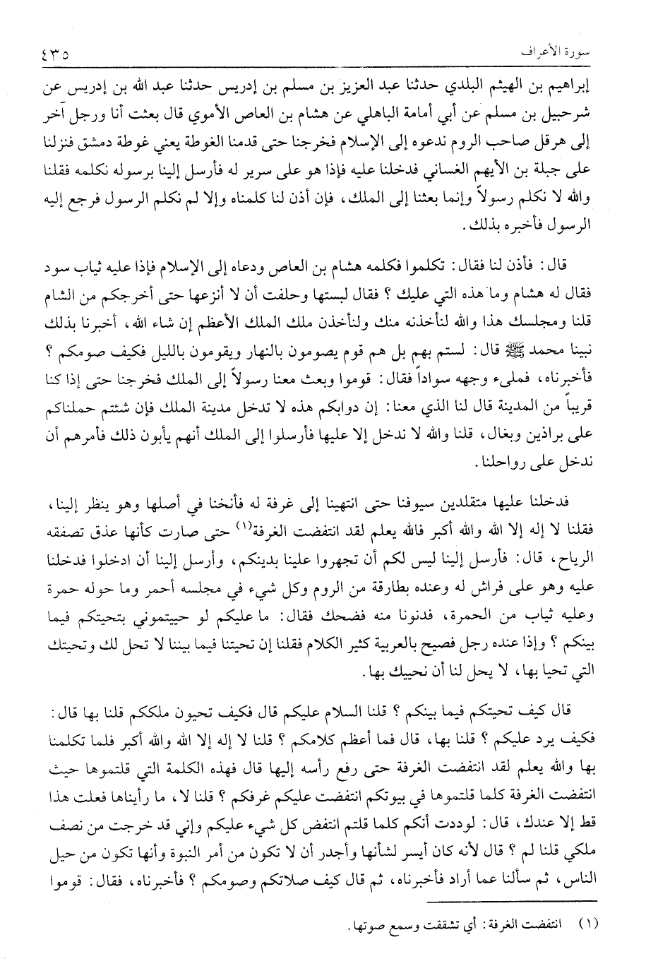 فدخلنا عليها متقلدين سيوفنا حتى انتهينا إلى غرفة له فَأَنَخْنَا فِي أَصْلِهَا وَهُوَ يَنْظُرُ إِلَيْنَا، فَقُلْنَا لَا إِلَهَ إِلَّا اللَّهُ وَاللَّهُ أَكْبَرُ فَاللَّهُ يعلم لقد انتفضت الْغُرْفَةُ «1» حَتَّى صَارَتْ كَأَنَّهَا عِذْقٌ تَصَفَقُهُ الرِّيَاحُ، قال: فَأَرْسَلَ إِلَيْنَا لَيْسَ لَكُمْ أَنْ تَجْهَرُوا عَلَيْنَا بِدِينِكُمْ، وَأَرْسَلَ إِلَيْنَا أَنِ ادْخُلُوا فَدَخَلْنَا عَلَيْهِ وهو على فراش له وعنده بطارقة مِنَ الرُّومُ وَكُلُّ شَيْءٍ فِي مَجْلِسِهِ أَحْمَرُ وَمَا حَوْلَهُ حُمْرَةٌ وَعَلَيْهِ ثِيَابٌ مِنَ الْحُمْرَةِ، فدنونا منه فضحك فقال: ما عَلَيْكُمْ لَوْ حَيَّيْتُمُونِي بِتَحِيَّتِكُمْ فِيمَا بَيْنَكُمْ؟ وَإِذَا عِنْدَهُ رَجُلٌ فَصِيحٌ بِالْعَرَبِيَّةِ كَثِيرُ الْكَلَامِ فَقُلْنَا إِنْ تَحِيَّتَنَا فِيمَا بَيْنَنَا لَا تَحِلُّ لَكَ وتحيتك التي تحيا بها، لا يحل لَنَا أَنْ نُحَيِّيَكَ بِهَا.
