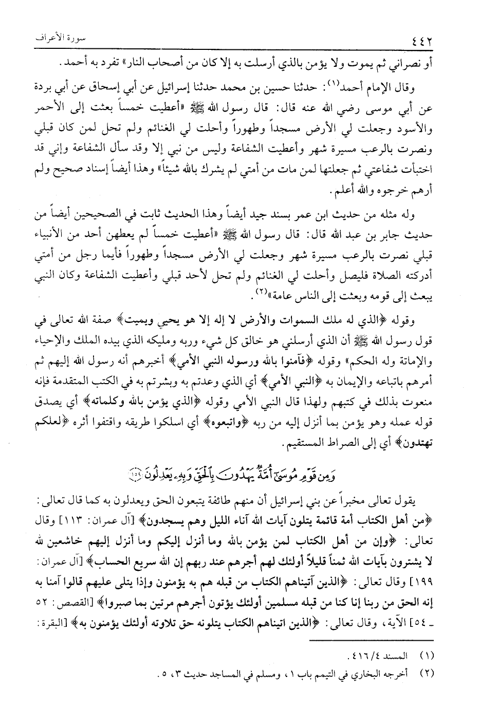 199] وَقَالَ تَعَالَى: الَّذِينَ آتَيْناهُمُ الْكِتابَ مِنْ قَبْلِهِ هُمْ بِهِ يُؤْمِنُونَ وَإِذا يُتْلى عَلَيْهِمْ قالُوا آمَنَّا بِهِ إِنَّهُ الْحَقُّ مِنْ رَبِّنا إِنَّا كُنَّا مِنْ قَبْلِهِ مُسْلِمِينَ أُولئِكَ يُؤْتَوْنَ أَجْرَهُمْ مَرَّتَيْنِ بِما صَبَرُوا [القصص: 52- 54] الآية، وَقَالَ تَعَالَى: الَّذِينَ آتَيْناهُمُ الْكِتابَ يَتْلُونَهُ حَقَّ تِلاوَتِهِ أُولئِكَ يُؤْمِنُونَ بِهِ [البقرة: