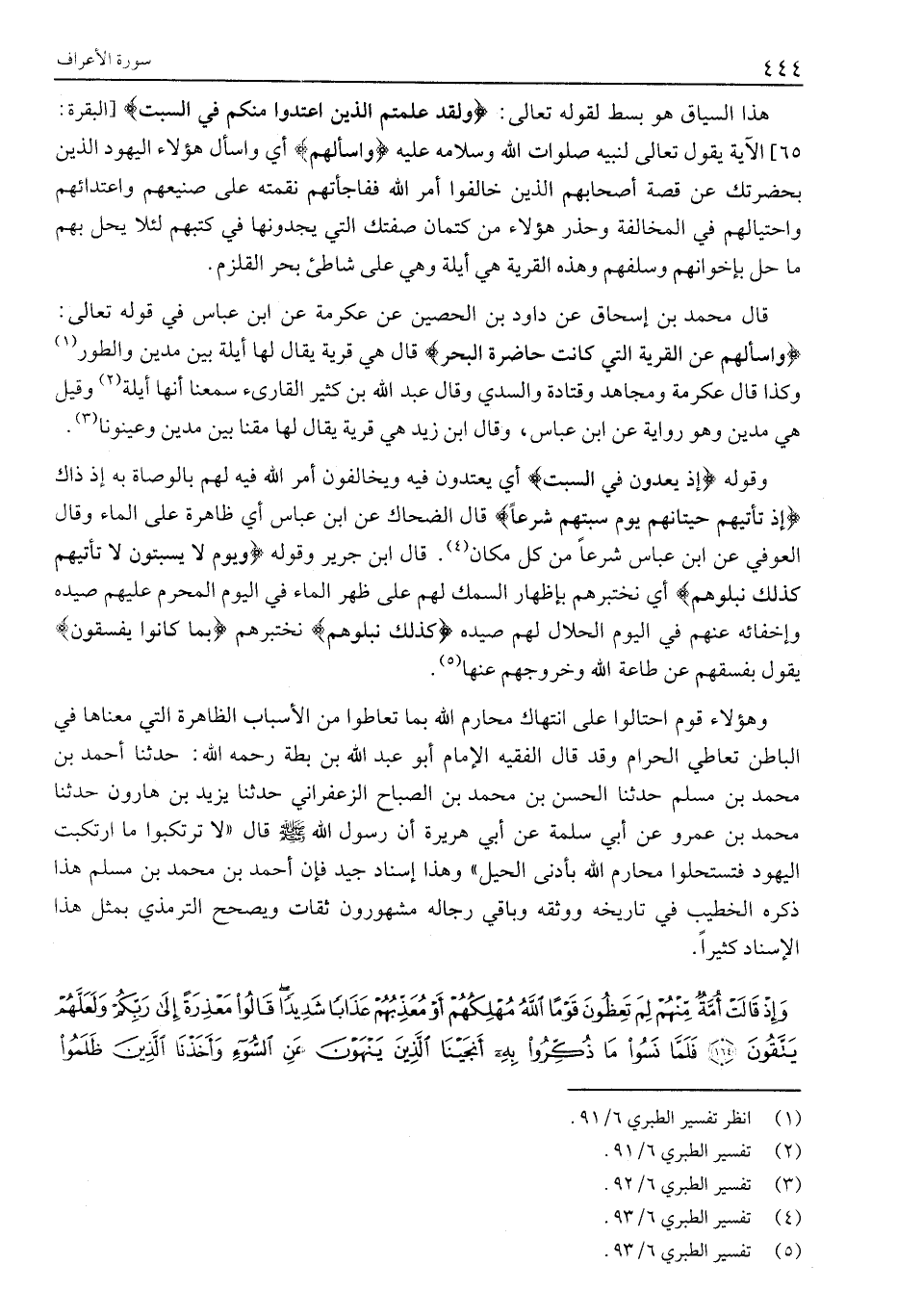 65] الآية يَقُولُ تَعَالَى لِنَبِيِّهِ صَلَوَاتُ اللَّهِ وَسَلَامُهُ عَلَيْهِ وَسْئَلْهُمْ أَيْ وَاسْأَلْ هَؤُلَاءِ الْيَهُودَ الَّذِينَ بِحَضْرَتِكَ عَنْ قِصَّةِ أَصْحَابِهِمُ الَّذِينَ خَالَفُوا أَمْرَ اللَّهِ فَفَاجَأَتْهُمْ نِقْمَتُهُ عَلَى صَنِيعِهِمْ وَاعْتِدَائِهِمْ وَاحْتِيَالِهِمْ فِي الْمُخَالَفَةِ وَحَذِّرْ هَؤُلَاءِ مِنْ كِتْمَانِ صِفَتِكَ الَّتِي يَجِدُونَهَا فِي كُتُبِهِمْ لِئَلَّا يَحِلَّ بِهِمْ مَا حَلَّ بِإِخْوَانِهِمْ وَسَلَفِهِمْ وَهَذِهِ الْقَرْيَةُ هِيَ أَيْلَةُ وَهِيَ عَلَى شَاطِئِ بَحْرِ الْقُلْزُمِ.