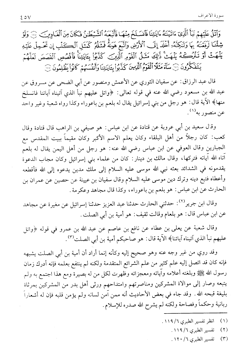 قَالَ عَبْدُ الرَّزَّاقِ: عَنْ سُفْيَانَ الثَّوْرِيِّ عَنِ الْأَعْمَشِ وَمَنْصُورٍ عَنْ أَبِي الضُّحَى عَنْ مَسْرُوقٍ عَنْ عَبْدِ اللَّهِ بْنِ مَسْعُودٍ رَضِيَ اللَّهُ عَنْهُ فِي قَوْلِهِ تَعَالَى: وَاتْلُ عَلَيْهِمْ نَبَأَ الَّذِي آتَيْناهُ آياتِنا فَانْسَلَخَ مِنْها الْآيَةَ قَالَ: هُوَ رَجُلٌ مِنْ بَنِي إِسْرَائِيلَ يقال له بلعم بن باعوراء وَكَذَا رَوَاهُ شُعْبَةُ وَغَيْرُ وَاحِدٍ عَنْ مَنْصُورٍ بِهِ «1» .