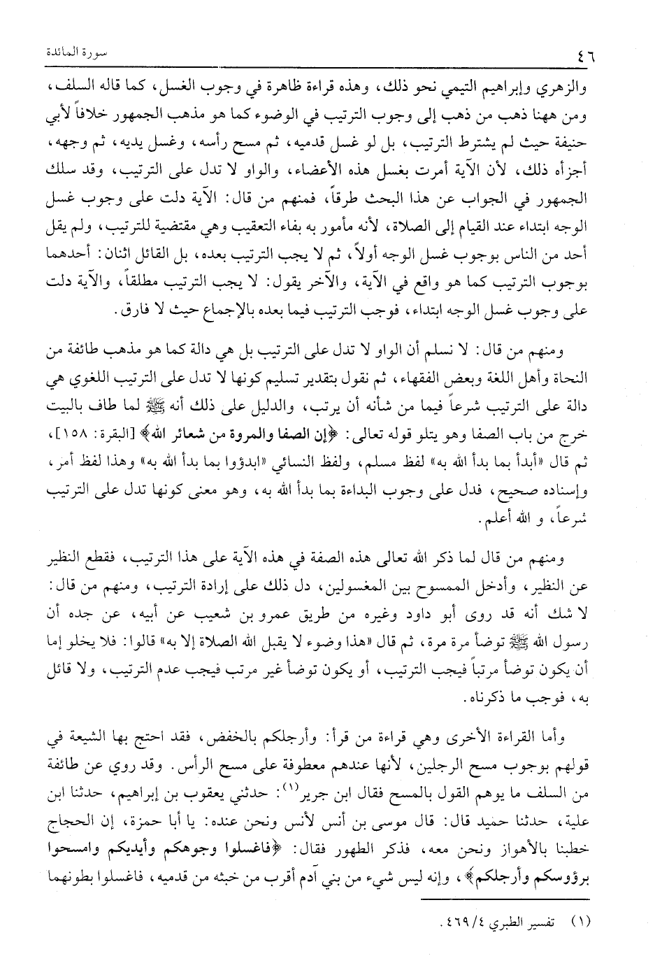 وَالزُّهْرِيِّ وَإِبْرَاهِيمَ التَّيْمِيِّ نَحْوُ ذَلِكَ، وَهَذِهِ قِرَاءَةٌ ظَاهِرَةٌ فِي وُجُوبِ الْغَسْلِ، كَمَا قَالَهُ السَّلَفُ، وَمِنْ هَاهُنَا ذَهَبَ مَنْ ذَهَبَ إِلَى وُجُوبِ الترتيب في الوضوء كَمَا هُوَ مَذْهَبُ الْجُمْهُورِ خِلَافًا لِأَبِي حَنِيفَةَ حَيْثُ لَمْ يَشْتَرِطِ التَّرْتِيبَ، بَلْ لَوْ غَسَلَ قَدَمَيْهِ، ثُمَّ مَسَحَ رَأْسَهُ، وَغَسَلَ يَدَيْهِ، ثُمَّ وَجْهَهُ، أَجَزْأَهُ ذَلِكَ، لَأَنَّ الْآيَةَ أَمَرَتْ بِغَسْلِ هذه الأعضاء، والواو لَا تَدُلُّ عَلَى التَّرْتِيبِ، وَقَدْ سَلَكَ الْجُمْهُورُ فِي الْجَوَابِ عَنْ هَذَا الْبَحْثِ طُرُقًا، فَمِنْهُمْ مَنْ قَالَ: الْآيَةُ دَلَّتْ عَلَى وُجُوبِ غَسْلِ الْوَجْهِ ابْتِدَاءً عِنْدَ الْقِيَامِ إِلَى الصَّلَاةِ، لِأَنَّهُ مَأْمُورٌ بِهِ بِفَاءِ التَّعْقِيبِ وَهِيَ مُقْتَضِيَةٌ لِلتَّرْتِيبِ، وَلَمْ يُقِلْ أَحَدٌ مِنَ النَّاسِ بِوُجُوبِ غَسْلِ الْوَجْهِ أَوَّلًا، ثُمَّ لَا يَجِبُ التَّرْتِيبُ بَعْدَهُ، بل القائل اثنان: أحدهما بوجوب التَّرْتِيبَ كَمَا هُوَ وَاقِعٌ فِي الْآيَةِ، وَالْآخَرُ يَقُولُ: لَا يَجِبُ التَّرْتِيبُ مُطْلَقًا، وَالْآيَةُ دَلَّتْ عَلَى وُجُوبِ غَسْلِ الْوَجْهِ ابْتِدَاءً، فَوَجَبَ التَّرْتِيبُ فِيمَا بَعْدَهُ بِالْإِجْمَاعِ حَيْثُ لَا فَارِقَ.