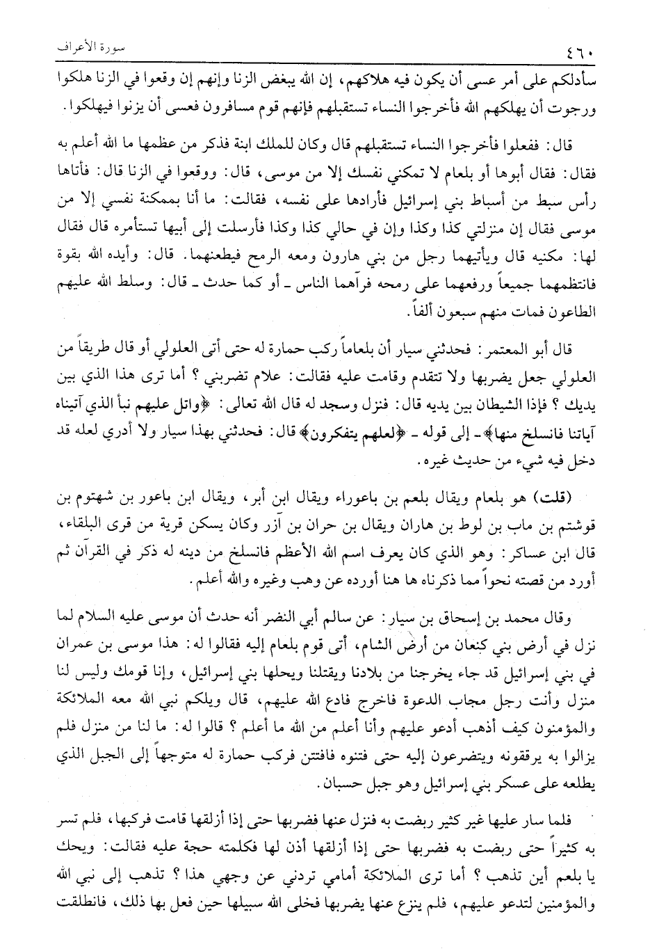 قَالَ أَبُو الْمُعْتَمِرِ: فحدثني سيار أن بلعاما رَكِبَ حَمَّارَةً لَهُ حَتَّى أَتَى الْعَلُولَى أَوْ قَالَ طَرِيقًا مِنَ الْعَلُولَى جَعَلَ يَضْرِبُهَا وَلَا تتقدم وَقَامَتْ عَلَيْهِ فَقَالَتْ: عَلَامَ تَضْرِبُنِي؟ أَمَا تَرَى هَذَا الَّذِي بَيْنَ يَدَيْكَ؟ فَإِذَا الشَّيْطَانُ بَيْنَ يَدَيْهِ قَالَ: فَنَزَلَ وَسَجَدَ لَهُ قَالَ اللَّهُ تَعَالَى: وَاتْلُ عَلَيْهِمْ نَبَأَ الَّذِي آتَيْناهُ آياتِنا فَانْسَلَخَ مِنْها- إِلَى قَوْلِهِ- لَعَلَّهُمْ يَتَفَكَّرُونَ قَالَ: فَحَدَّثَنِي بِهَذَا سَيَّارٌ وَلَا أَدْرِي لَعَلَّهُ قَدْ دَخَلَ فِيهِ شَيْءٌ مِنْ حَدِيثِ غَيْرِهِ.