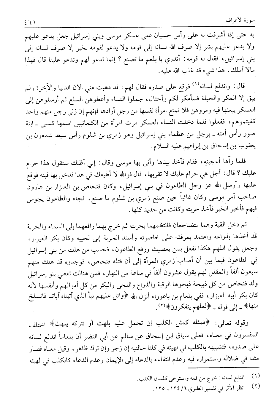 وَقَوْلُهُ تَعَالَى: فَمَثَلُهُ كَمَثَلِ الْكَلْبِ إِنْ تَحْمِلْ عَلَيْهِ يَلْهَثْ أَوْ تَتْرُكْهُ يَلْهَثْ اختلف المفسرون في معناه، فعلى سياق ابن إسحاق عن سالم عن أبي النضر أن بلعاما انْدَلَعَ لِسَانُهُ عَلَى صَدْرِهِ، فَتَشْبِيهُهُ بِالْكَلْبِ فِي لهيثه فِي كِلْتَا حَالَتَيْهِ إِنْ زُجِرَ وَإِنْ تُرِكَ ظاهر، وَقِيلَ مَعْنَاهُ فَصَارَ مِثْلَهُ فِي ضَلَالِهِ وَاسْتِمْرَارِهِ فِيهِ وَعَدَمِ انْتِفَاعِهِ بِالدُّعَاءِ إِلَى الْإِيمَانِ وَعَدَمِ الدعاء كالكلب في لهيثه