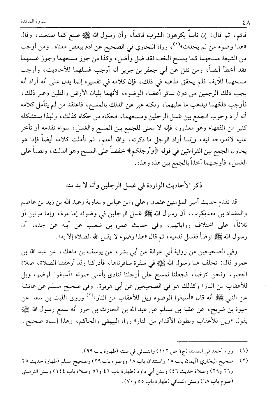 قَائِمٌ، ثُمَّ قَالَ: إِنَّ نَاسًا يَكْرَهُونَ الشُّرْبَ قَائِمًا، وَإِنَّ رَسُولَ اللَّهِ صَلَّى اللَّهُ عَلَيْهِ وسلم صنع كما صَنَعْتُ، وَقَالَ «هَذَا وُضُوءُ مَنْ لَمْ يُحْدِثْ» «1» ، رَوَاهُ الْبُخَارِيُّ فِي الصَّحِيحِ عَنْ آدَمَ بِبَعْضِ مَعْنَاهُ. وَمَنْ أَوْجَبَ مِنَ الشِّيعَةِ مَسْحَهُمَا كَمَا يَمْسَحُ الْخُفَّ فَقَدْ ضَلَّ وَأَضَلَّ، وَكَذَا مَنْ جَوَّزَ مَسْحَهُمَا وَجَوَّزَ غَسْلَهُمَا فَقَدْ أَخْطَأَ أَيْضًا، وَمَنْ نَقَلَ عَنْ أَبِي جَعْفَرِ بْنِ جَرِيرٍ أَنَّهُ أَوْجَبَ غَسْلَهُمَا لِلْأَحَادِيثِ، وَأَوْجَبَ مَسْحَهُمَا لِلْآيَةِ، فَلَمْ يُحَقِّقْ مَذْهَبَهُ فِي ذَلِكَ، فَإِنَّ كَلَامَهُ فِي تَفْسِيرِهِ إِنَّمَا يَدُلُّ عَلَى أَنَّهُ أَرَادَ أَنَّهُ يَجِبُ دَلْكُ الرِّجْلَيْنِ مِنْ دُونِ سَائِرِ أَعْضَاءِ الْوُضُوءِ، لِأَنَّهُمَا يَلِيَانِ الْأَرْضَ وَالطِّينَ وَغَيْرَ ذَلِكَ، فَأَوْجَبَ دَلْكَهُمَا لِيَذْهَبَ مَا عَلَيْهِمَا، وَلَكِنَّهُ عَبَّرَ عَنِ الدَّلْكِ بِالْمَسْحِ، فَاعْتَقَدَ مَنْ لَمْ يَتَأَمَّلْ كَلَامَهُ أَنَّهُ أَرَادَ وُجُوبَ الْجَمْعِ بَيْنَ غَسْلِ الرِّجْلَيْنِ وَمَسْحِهِمَا، فَحَكَاهُ مَنْ حَكَاهُ كَذَلِكَ، وَلِهَذَا يَسْتَشْكِلُهُ كَثِيرٌ مِنَ الْفُقَهَاءِ وَهُوَ مَعْذُورٌ، فَإِنَّهُ لَا مَعْنَى لِلْجَمْعِ بَيْنَ الْمَسْحِ وَالْغَسْلِ، سَوَاءٌ تَقَدَّمَهُ أَوْ تَأَخَّرَ عَلَيْهِ لِانْدِرَاجِهِ فِيهِ، وَإِنَّمَا أَرَادَ الرَّجُلُ مَا ذَكَرْتُهُ، وَاللَّهُ أَعْلَمُ، ثُمَّ تَأَمَّلْتُ كَلَامَهُ أَيْضًا فَإِذَا هُوَ يُحَاوِلُ الْجَمْعَ بَيْنَ الْقِرَاءَتَيْنِ فِي قَوْلِهِ وَأَرْجُلَكُمْ خَفْضًا عَلَى الْمَسْحِ وَهُوَ الدَّلْكُ، وَنَصْبًا عَلَى الْغَسْلِ، فَأَوْجَبَهُمَا أَخْذًا بِالْجَمْعِ بَيْنَ هَذِهِ وَهَذِهِ.