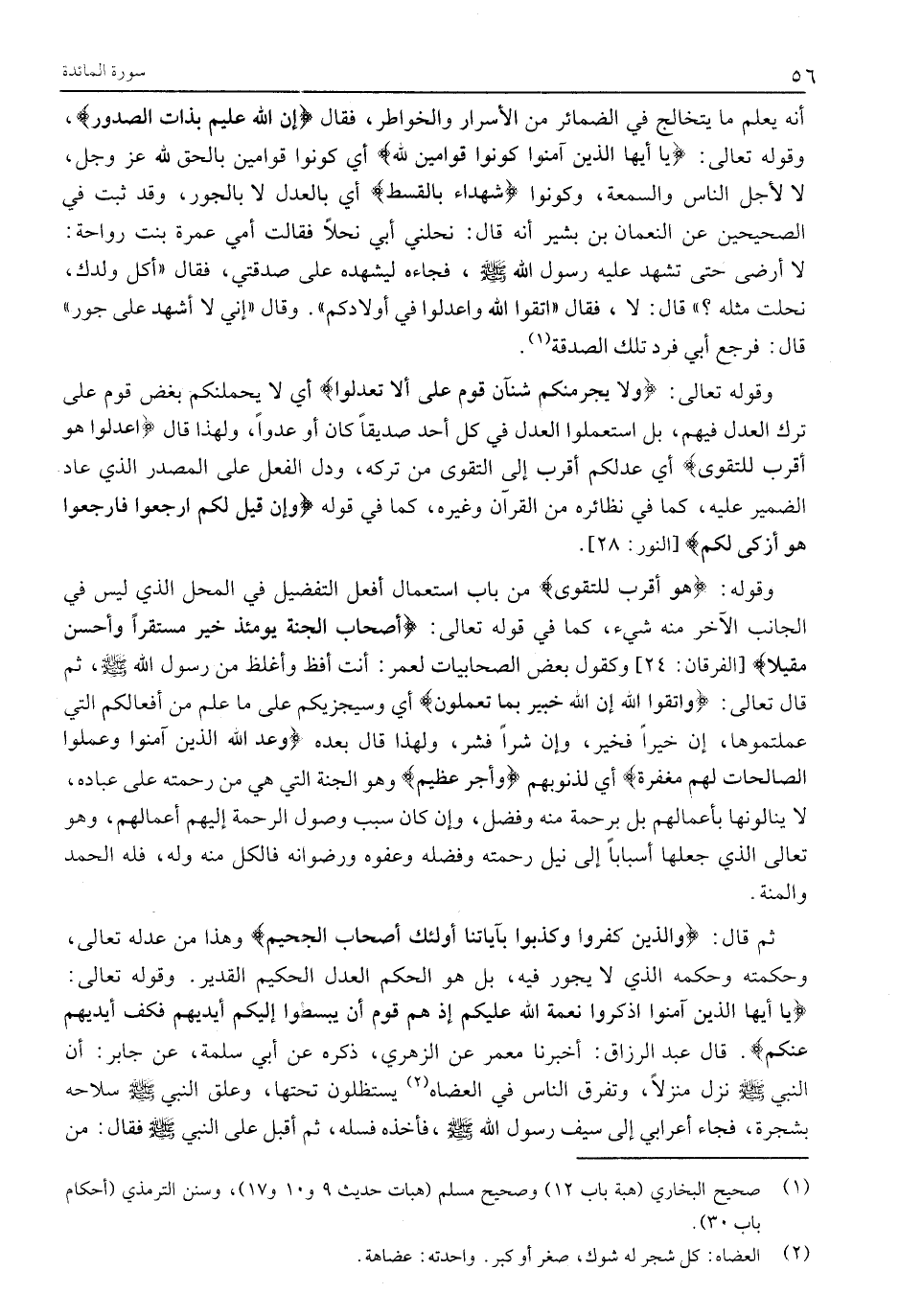 أنه يعلم ما يتخالج في الضمائر مِنَ الْأَسْرَارِ وَالْخَوَاطِرِ، فَقَالَ إِنَّ اللَّهَ عَلِيمٌ بِذاتِ الصُّدُورِ، وقوله تَعَالَى: يَا أَيُّهَا الَّذِينَ آمَنُوا كُونُوا قَوَّامِينَ لِلَّهِ أَيْ كُونُوا قَوَّامِينَ بِالْحَقِّ لِلَّهِ عَزَّ وَجَلَّ، لَا لِأَجْلِ النَّاسِ وَالسُّمْعَةِ، وَكُونُوا شُهَداءَ بِالْقِسْطِ أَيْ بِالْعَدْلِ لَا بِالْجَوْرِ، وَقَدْ ثَبَتَ فِي الصَّحِيحَيْنِ عَنِ النُّعْمَانِ بْنِ بَشِيرٍ أَنَّهُ قَالَ: نَحَلَنِي أَبِي نَحْلًا فَقَالَتْ أُمِّي عَمْرَةُ بنت رواحة: