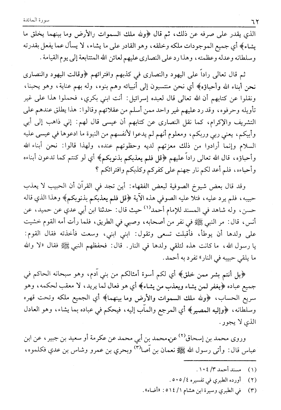وَقَدْ قَالَ بَعْضُ شُيُوخِ الصُّوفِيَّةِ لِبَعْضِ الْفُقَهَاءِ: أَيْنَ تَجِدُ فِي الْقُرْآنِ أَنَّ الْحَبِيبَ لَا يعذب حبيبه، فلم يرد عليه، فتلا عليه الصُّوفِيُّ هَذِهِ الْآيَةَ قُلْ فَلِمَ يُعَذِّبُكُمْ بِذُنُوبِكُمْ وَهَذَا الَّذِي قَالَهُ حَسَنٌ، وَلَهُ شَاهِدٌ فِي الْمُسْنَدِ لِلْإِمَامِ أَحْمَدَ «1» حَيْثُ قَالَ: حَدَّثَنَا ابْنُ أَبِي عَدِيٍّ عَنْ حُمَيْدٍ، عَنْ أَنَسٍ، قَالَ: مَرَّ النَّبِيُّ صَلَّى اللَّهُ عَلَيْهِ وَسَلَّمَ فِي نَفَرٍ مِنْ أَصْحَابِهِ، وَصَبِيٍّ فِي الطَّرِيقِ، فَلَمَّا رَأَتْ أُمُّهُ الْقَوْمَ خَشِيَتْ عَلَى وَلَدِهَا أَنْ يُوطَأَ، فَأَقْبَلَتْ تَسْعَى وَتَقُولُ: ابْنَيِ ابْنِي، وَسَعَتْ فَأَخَذَتْهُ فَقَالَ الْقَوْمُ: