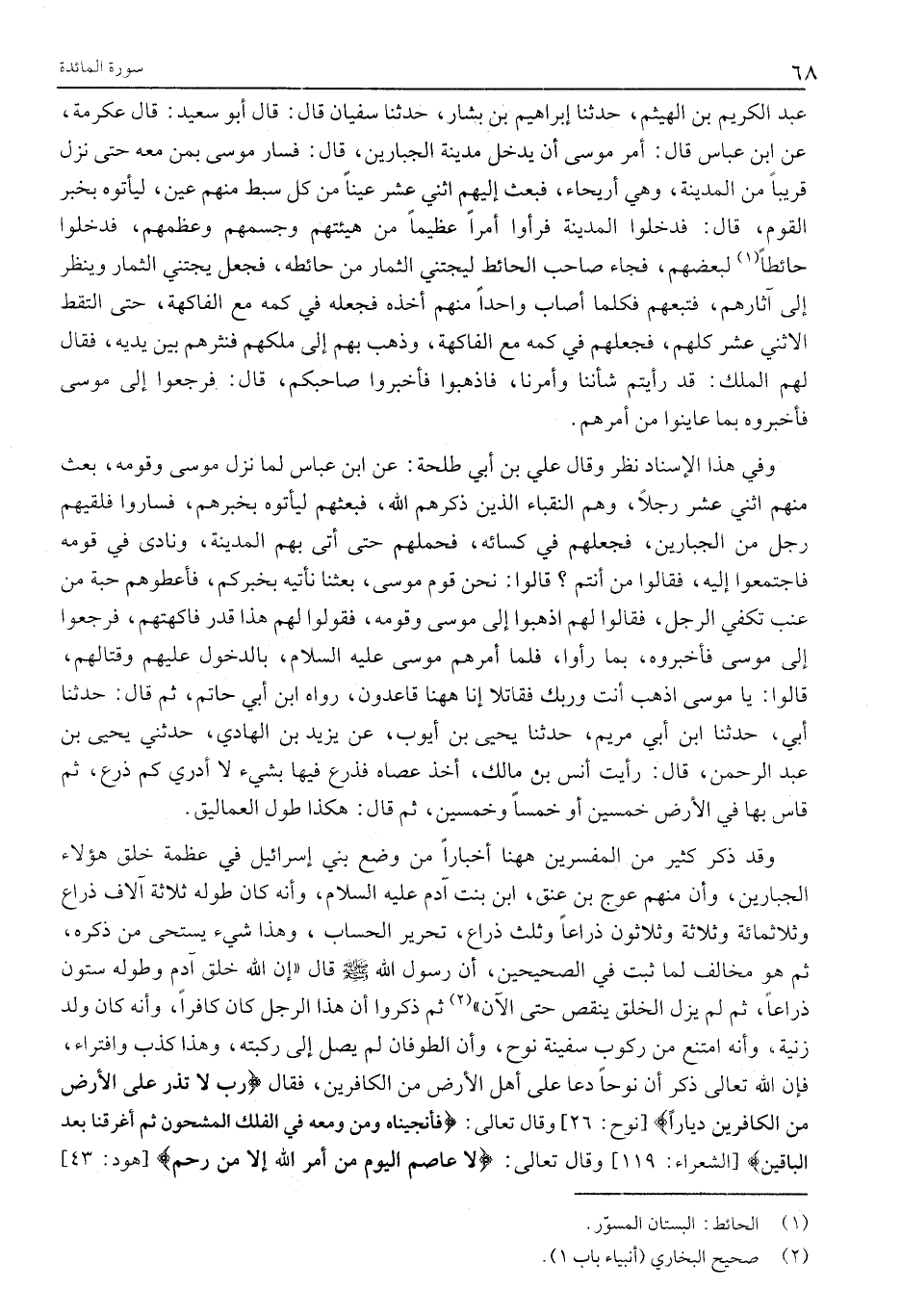 عَبْدُ الْكَرِيمِ بْنُ الْهَيْثَمِ، حَدَّثَنَا إِبْرَاهِيمُ بْنُ بَشَّارٍ، حَدَّثَنَا سُفْيَانُ قَالَ: قَالَ أَبُو سَعِيدٍ: قَالَ عِكْرَمَةُ، عَنِ ابْنِ عَبَّاسٍ قَالَ: أُمِرَ مُوسَى أَنْ يَدْخُلَ مَدِينَةَ الْجَبَّارِينَ، قَالَ: فَسَارَ مُوسَى بِمَنْ مَعَهُ حَتَّى نَزَلَ قَرِيبًا مِنَ المدينة، وهي أريحاء، فَبَعَثَ إِلَيْهِمُ اثْنَيْ عَشَرَ عَيْنًا مِنْ كُلِّ سِبْطٍ مِنْهُمْ عَيْنٌ، لِيَأْتُوهُ بِخَبَرِ الْقَوْمِ، قَالَ: فَدَخَلُوا الْمَدِينَةَ فَرَأَوْا أَمْرًا عَظِيمًا مِنْ هَيْئَتِهِمْ وجسمهم وَعَظْمِهِمْ، فَدَخَلُوا حَائِطًا «1» لِبَعْضِهِمْ، فَجَاءَ صَاحِبُ الْحَائِطِ لِيَجْتَنِيَ الثِّمَارَ مَنْ حَائِطِهِ، فَجَعَلَ يَجْتَنِي الثِّمَارَ وينظر إلى آثارهم، فتبعهم فَكُلَّمَا أَصَابَ وَاحِدًا مِنْهُمْ أَخَذَهُ فَجَعَلَهُ فِي كُمِّهِ مَعَ الْفَاكِهَةِ، حَتَّى الْتَقَطَ الِاثْنَيْ عَشَرَ كُلَّهُمْ، فَجَعَلَهُمْ فِي كُمِّهِ مَعَ الْفَاكِهَةِ، وَذَهَبَ بهم إِلَى مَلِكِهِمْ فَنَثَرَهُمْ بَيْنَ يَدَيْهِ، فَقَالَ لَهُمُ الْمَلِكُ: قَدْ رَأَيْتُمْ شَأْنَنَا وَأَمْرَنَا، فَاذْهَبُوا فَأَخْبِرُوا صَاحِبَكُمْ، قَالَ: فَرَجَعُوا إِلَى مُوسَى فَأَخْبَرُوهُ بِمَا عَايَنُوا مِنْ أَمْرِهِمْ.