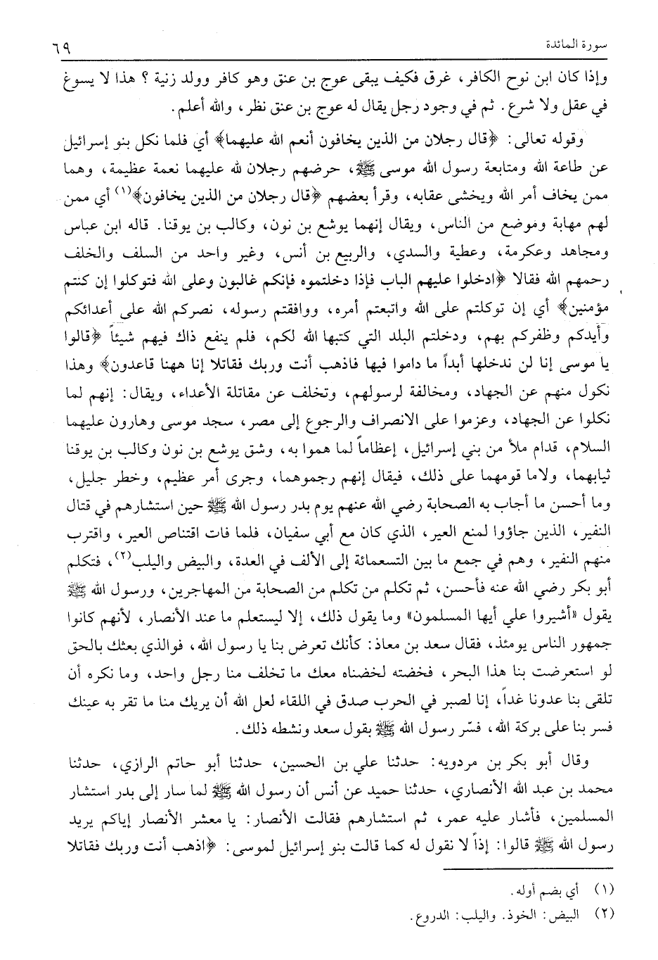 وَقَوْلُهُ تعالى: قالَ رَجُلانِ مِنَ الَّذِينَ يَخافُونَ أَنْعَمَ اللَّهُ عَلَيْهِمَا أَيْ فَلَمَّا نَكَلَ بَنُو إِسْرَائِيلَ عَنْ طاعة الله ومتابعة رسول الله موسى صلّى الله عليه وسلم، حَرَّضَهُمْ رَجُلَانِ لِلَّهِ عَلَيْهِمَا نِعْمَةٌ عَظِيمَةٌ، وَهُمَا مِمَّنْ يَخَافُ أَمْرَ اللَّهِ وَيَخْشَى عِقَابَهُ، وَقَرَأَ بَعْضُهُمْ قالَ رَجُلانِ مِنَ الَّذِينَ يَخافُونَ «1» أَيْ مِمَّنْ لَهُمْ مَهَابَةٌ وَمَوْضِعٌ مِنَ النَّاسِ، وَيُقَالُ إنهما يوشع بن نون، وكالب بن يوقنا. قَالَهُ ابْنُ عَبَّاسٍ وَمُجَاهِدٌ وَعِكْرِمَةُ، وَعَطِيَّةُ وَالسُّدِّيُّ، وَالرَّبِيعُ بْنُ أَنَسٍ، وَغَيْرُ وَاحِدٍ مِنَ السَّلَفِ وَالْخَلَفِ رَحِمَهُمُ اللَّهُ فَقَالَا ادْخُلُوا عَلَيْهِمُ الْبابَ فَإِذا دَخَلْتُمُوهُ فَإِنَّكُمْ غالِبُونَ وَعَلَى اللَّهِ فَتَوَكَّلُوا إِنْ كُنْتُمْ مُؤْمِنِينَ أي إن تَوَكَّلْتُمْ عَلَى اللَّهِ وَاتَّبَعْتُمْ أَمْرَهُ، وَوَافَقْتُمْ رَسُولَهُ، نَصَرَكُمُ اللَّهُ عَلَى أَعْدَائِكُمْ وَأَيَّدَكُمْ وَظَفَّرَكُمْ بِهِمْ، ودخلتم البلد الَّتِي كَتَبَهَا اللَّهُ لَكُمْ، فَلَمْ يَنْفَعْ ذَاكَ فِيهِمْ شَيْئًا قالُوا يَا مُوسى إِنَّا لَنْ نَدْخُلَها أَبَداً مَا دامُوا فِيها فَاذْهَبْ أَنْتَ وَرَبُّكَ فَقاتِلا إِنَّا هاهُنا قاعِدُونَ وَهَذَا نُكُولٌ مِنْهُمْ عَنِ الْجِهَادِ، وَمُخَالَفَةٌ لِرَسُولِهِمْ، وَتَخَلُّفٌ عَنْ مقاتلة الأعداء، ويقال: إنهم لما نكلوا عن الجهاد، وعزموا على الانصراف والرجوع إلى مصر، سَجَدَ مُوسَى وَهَارُونُ عَلَيْهِمَا السَّلَامُ، قُدَّامَ مَلَأٍ مِنْ بَنِي إِسْرَائِيلَ، إِعْظَامًا لِمَا هَمُّوا بِهِ، وشق يوشع بن نون وكالب بن يوقنا ثيابهما، ولا ما قَوْمَهُمَا عَلَى ذَلِكَ، فَيُقَالُ إِنَّهُمْ رَجَمُوهُمَا، وَجَرَى أَمْرٌ عَظِيمٌ، وَخَطَرٌ جَلِيلٌ، وَمَا أَحْسَنَ مَا أَجَابَ بِهِ الصَّحَابَةُ رَضِيَ اللَّهُ عَنْهُمْ يَوْمَ بَدْرٍ رَسُولَ اللَّهِ صَلَّى اللَّهُ عَلَيْهِ وَسَلَّمَ حِينَ اسْتَشَارَهُمْ فِي قِتَالِ النَّفِيرِ، الَّذِينَ جَاءُوا لِمَنْعِ الْعِيرِ، الَّذِي كَانَ مَعَ أَبِي سُفْيَانَ، فَلَمَّا فَاتَ اقْتِنَاصُ الْعِيرِ، وَاقْتَرَبَ مِنْهُمُ النَّفِيرُ، وَهَمَّ فِي جَمْعٍ مَا بَيْنَ التِّسْعِمِائَةِ إِلَى الْأَلْفِ فِي الْعُدَّةِ، وَالْبَيْضِ وَالْيَلَبِ «2» ، فَتَكَلَّمَ أَبُو بَكْرٍ رَضِيَ اللَّهُ عَنْهُ فَأَحْسَنَ، ثُمَّ تَكَلَّمَ مَنْ تَكَلَّمَ مِنَ الصَّحَابَةِ مِنَ الْمُهَاجِرِينَ، وَرَسُولُ اللَّهِ صَلَّى اللَّهُ عَلَيْهِ وَسَلَّمَ يَقُولُ «أَشِيرُوا عَلَيَّ أَيُّهَا الْمُسْلِمُونَ» وَمَا يَقُولُ ذَلِكَ، إِلَّا لِيَسْتَعْلِمَ مَا عِنْدَ الْأَنْصَارِ، لِأَنَّهُمْ كَانُوا جُمْهُورَ الناس يومئذ، فقال سعد بن معاذ: كأنك تعرض بنا يا رسول الله، فو الذي بَعَثَكَ بِالْحَقِّ لَوِ اسْتَعْرَضْتَ بِنَا هَذَا الْبَحْرَ، فخضته لخضناه معك ما تَخَلَّفَ مِنَّا رَجُلٌ وَاحِدٌ، وَمَا نَكْرَهُ أَنْ تَلْقَى بِنَا عَدُوَّنَا غَدًا، إِنَّا لَصُبُرٌ فِي الحرب صدق في اللقاء لعل اللَّهَ أَنْ يُرِيَكَ مِنَّا مَا تَقَرُّ بِهِ عَيْنُكَ فَسِرْ بِنَا عَلَى بَرَكَةِ اللَّهِ، فَسُرَّ رَسُولُ اللَّهِ صَلَّى اللَّهُ عَلَيْهِ وَسَلَّمَ بِقَوْلِ سَعْدٍ وَنَشَّطَهُ ذَلِكَ.