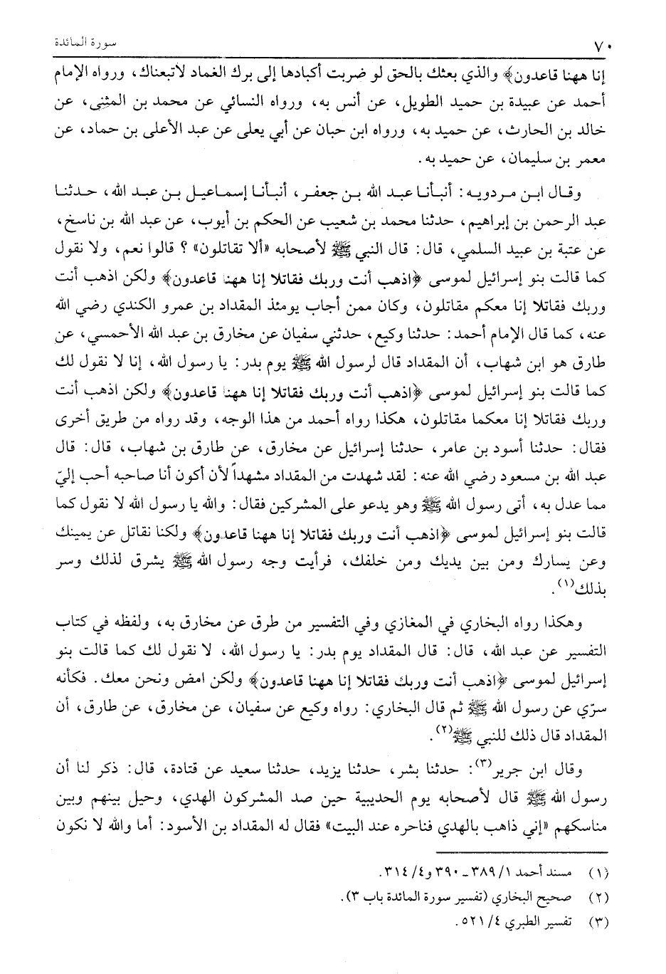 وقال ابن مردويه: أنبأنا عبد الله بن جعفر، أنبأنا إِسْمَاعِيلُ بْنُ عَبْدِ اللَّهِ، حَدَّثَنَا عَبْدُ الرَّحْمَنِ بْنُ إِبْرَاهِيمَ، حَدَّثَنَا مُحَمَّدُ بْنُ شُعَيْبٍ عَنِ الحكم بْنِ أَيُّوبَ، عَنْ عَبْدِ اللَّهِ بْنِ نَاسِخٍ، عن عتبة بن عبيد السُّلَمِيِّ، قَالَ: قَالَ النَّبِيُّ صَلَّى اللَّهُ عَلَيْهِ وَسَلَّمَ لِأَصْحَابِهِ «أَلَا تُقَاتِلُونَ» ؟ قَالُوا نَعَمْ، وَلَا نَقُولُ كَمَا قَالَتْ بَنُو إِسْرَائِيلَ لِمُوسَى فَاذْهَبْ أَنْتَ وَرَبُّكَ فَقاتِلا إِنَّا هاهُنا قاعِدُونَ وَلَكِنْ اذْهَبْ أَنْتَ وَرَبُّكَ فَقَاتَلَا إِنَّا مَعَكُمْ مُقَاتِلُونَ، وَكَانَ مِمَّنْ أَجَابَ يَوْمَئِذٍ الْمِقْدَادَ بْنَ عَمْرٍو الْكِنْدِيَّ رَضِيَ اللَّهُ عَنْهُ، كَمَا قَالَ الْإِمَامُ أحمد: حدثنا وكيع، حدثني سُفْيَانُ عَنْ مُخَارِقِ بْنِ عَبْدِ اللَّهِ الْأَحْمَسِيِّ، عَنْ طَارِقٍ هُوَ ابْنُ شِهَابٍ، أَنَّ الْمِقْدَادَ قَالَ لِرَسُولِ اللَّهِ صَلَّى اللَّهُ عَلَيْهِ وَسَلَّمَ يَوْمَ بِدْرٍ: يَا رَسُولَ اللَّهِ، إِنَّا لَا نَقُولُ لَكَ كَمَا قَالَتْ بَنُو إِسْرَائِيلَ لِمُوسَى فَاذْهَبْ أَنْتَ وَرَبُّكَ فَقاتِلا إِنَّا هاهُنا قاعِدُونَ وَلَكِنْ اذهب أنت وربك فقاتلا إنا معكما مُقَاتِلُونَ، هَكَذَا رَوَاهُ أَحْمَدُ مِنْ هَذَا الْوَجْهِ، وَقَدْ رَوَاهُ مِنْ طَرِيقٍ أُخْرَى فَقَالَ: حَدَّثَنَا أَسْوَدُ بْنُ عَامِرٍ، حَدَّثَنَا إِسْرَائِيلُ عَنْ مُخَارِقٍ، عَنْ طَارِقِ بْنِ شِهَابٍ، قَالَ: قَالَ عَبْدُ اللَّهِ بْنُ مَسْعُودٍ رَضِيَ اللَّهُ عَنْهُ: لَقَدْ شَهِدْتُ مِنَ الْمِقْدَادِ مَشْهَدًا لَأَنْ أَكُونَ أَنَا صَاحِبَهُ أَحَبُّ إِلَيَّ مِمَّا عُدِلَ بِهِ، أَتَى رَسُولَ اللَّهِ صَلَّى اللَّهُ عَلَيْهِ وَسَلَّمَ وَهُوَ يَدْعُو عَلَى الْمُشْرِكِينَ فَقَالَ: وَاللَّهِ يَا رَسُولَ اللَّهِ لَا نَقُولُ كَمَا قَالَتْ بَنُو إِسْرَائِيلَ لِمُوسَى فَاذْهَبْ أَنْتَ وَرَبُّكَ فَقاتِلا إِنَّا هاهُنا قاعِدُونَ وَلَكُنَّا نُقَاتِلُ عَنْ يَمِينِكَ وَعَنْ يَسَارِكَ وَمِنْ بَيْنِ يَدَيْكَ وَمِنْ خَلْفِكَ، فَرَأَيْتُ وَجْهَ رَسُولِ اللَّهِ صَلَّى اللَّهُ عَلَيْهِ وَسَلَّمَ يشرق لذلك وسر بِذَلِكَ «1» .