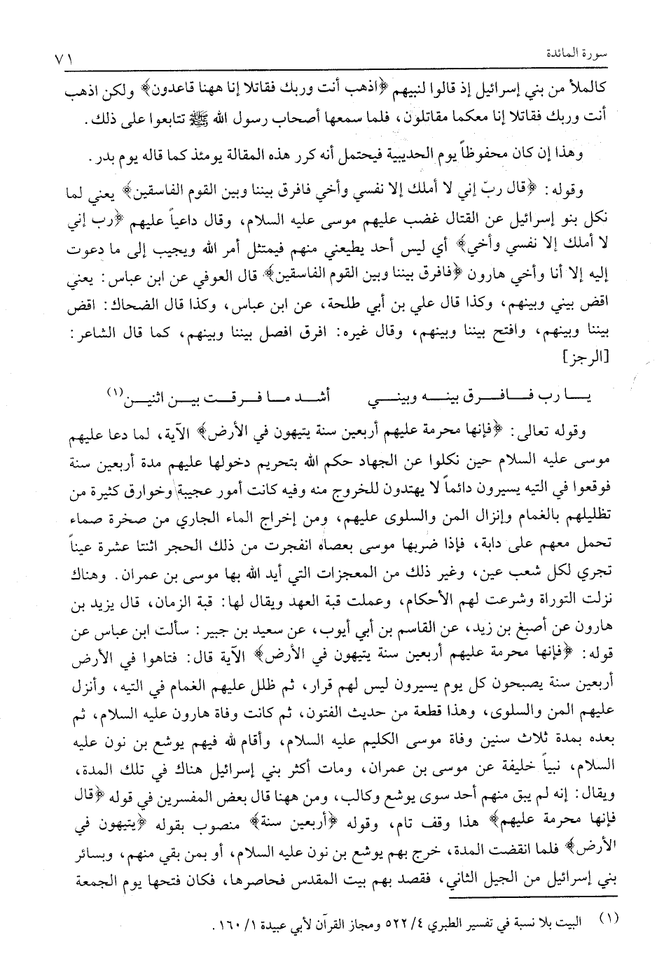 وقوله تعالى: فَإِنَّها مُحَرَّمَةٌ عَلَيْهِمْ أَرْبَعِينَ سَنَةً يَتِيهُونَ فِي الْأَرْضِ الآية، لَمَّا دَعَا عَلَيْهِمْ مُوسَى عَلَيْهِ السَّلَامُ حِينَ نكلوا عن الجهاد حكم الله بتحريم دخولها عليهم مُدَّةَ أَرْبَعِينَ سَنَةً فَوَقَعُوا فِي التِّيهِ يَسِيرُونَ دَائِمًا لَا يَهْتَدُونَ لِلْخُرُوجِ مِنْهُ وَفِيهِ كَانَتْ أُمُورٌ عَجِيبَةٌ وَخَوَارِقُ كَثِيرَةٌ مِنْ تَظْلِيلِهِمْ بِالْغَمَامِ وَإِنْزَالِ الْمَنِّ وَالسَّلْوَى عَلَيْهِمْ، وَمِنْ إِخْرَاجِ الْمَاءِ الْجَارِي مِنْ صَخْرَةٍ صَمَّاءَ تُحْمَلُ مَعَهُمْ عَلَى دَابَّةٍ، فَإِذَا ضَرَبَهَا مُوسَى بِعَصَاهُ انْفَجَرَتْ مِنْ ذَلِكَ الْحَجَرِ اثْنَتَا عَشْرَةَ عَيْنًا تَجْرِي لِكُلِّ شِعْبٍ عَيْنٌ، وَغَيْرُ ذَلِكَ مِنَ الْمُعْجِزَاتِ الَّتِي أَيَّدَ اللَّهُ بِهَا مُوسَى بْنَ عِمْرَانَ. وَهُنَاكَ نزلت التَّوْرَاةُ وَشُرِعَتْ لَهُمُ الْأَحْكَامُ، وَعُمِلَتْ قُبَّةُ الْعَهْدِ وَيُقَالُ لَهَا: قُبَّةُ الزَّمَانِ، قَالَ يَزِيدُ بْنُ هَارُونَ عَنْ أَصْبَغَ بْنِ زَيْدٍ، عَنِ الْقَاسِمِ بْنِ أَبِي أَيُّوبَ، عَنْ سَعِيدِ بن جبير: سَأَلْتُ ابْنَ عَبَّاسٍ عَنْ قَوْلِهِ: فَإِنَّها مُحَرَّمَةٌ عَلَيْهِمْ أَرْبَعِينَ سَنَةً يَتِيهُونَ فِي الْأَرْضِ الْآيَةَ قَالَ: فَتَاهُوا فِي الْأَرْضِ أَرْبَعِينَ سَنَةً يُصْبِحُونَ كُلَّ يَوْمٍ يَسِيرُونَ لَيْسَ لَهُمْ قَرَارٌ، ثُمَّ ظَلَّلَ عَلَيْهِمُ الْغَمَامَ فِي التِّيهِ، وَأَنْزَلَ عَلَيْهِمُ الْمَنَّ وَالسَّلْوَى، وَهَذَا قِطْعَةٌ مِنْ حَدِيثِ الْفُتُونِ، ثُمَّ كَانَتْ وَفَاةُ هَارُونَ عَلَيْهِ السَّلَامُ، ثُمَّ بعده بمدة ثلاث سنين وفاة موسى الكليم عليه السلام، وأقام لله فِيهِمْ يُوشَعَ بْنَ نُونٍ عَلَيْهِ السَّلَامُ، نَبِيًّا خَلِيفَةً عَنْ مُوسَى بْنِ عِمْرَانَ، وَمَاتَ أَكْثَرُ بَنِي إِسْرَائِيلَ هُنَاكَ فِي تِلْكَ الْمُدَّةِ، وَيُقَالُ: إِنَّهُ لَمْ يَبْقَ مِنْهُمْ أَحَدٌ سِوَى يُوشِعَ وكالب، وَمِنْ هَاهُنَا قَالَ بَعْضُ الْمُفَسِّرِينَ فِي قَوْلِهِ قالَ فَإِنَّها مُحَرَّمَةٌ عَلَيْهِمْ هَذَا وَقْفٌ تَامٌّ، وَقَوْلُهُ أَرْبَعِينَ سَنَةً مَنْصُوبٌ بِقَوْلِهِ يَتِيهُونَ فِي الْأَرْضِ فَلَمَّا انْقَضَتِ الْمُدَّةُ، خَرَجَ بِهِمْ يُوشَعُ بْنُ نُونٍ عَلَيْهِ السَّلَامُ، أَوْ بِمَنْ بَقِيَ مِنْهُمْ، وَبِسَائِرِ بَنِي إِسْرَائِيلَ مِنَ الْجِيلِ الثَّانِي، فَقَصَدَ بِهِمْ بَيْتَ الْمَقْدِسِ فَحَاصَرَهَا، فَكَانَ فَتْحُهَا يوم الجمعة