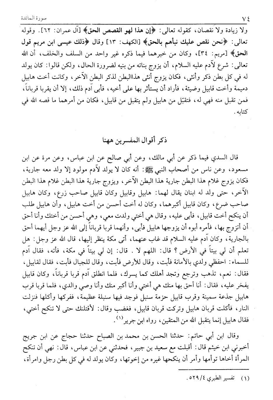 ولا زيادة ولا نقصان، كقوله تَعَالَى: إِنَّ هَذَا لَهُوَ الْقَصَصُ الْحَقُّ [آلِ عمران: 62] . وقوله تَعَالَى: نَحْنُ نَقُصُّ عَلَيْكَ نَبَأَهُمْ بِالْحَقِّ [الْكَهْفِ: 13] وقال ذلِكَ عِيسَى ابْنُ مَرْيَمَ قَوْلَ الْحَقِّ [مَرْيَمَ: 34] ، وَكَانَ مِنْ خَبَرِهِمَا فِيمَا ذَكَرَهُ غَيْرُ وَاحِدٍ مِنَ السَّلَفِ وَالْخَلَفِ، أَنَّ اللَّهَ تَعَالَى: شَرَعَ لِآدَمَ عَلَيْهِ السَّلَامُ، أَنْ يُزَوِّجَ بَنَاتِهِ مِنْ بَنِيهِ لِضَرُورَةِ الْحَالِ، وَلَكِنْ قَالُوا: كَانَ يُولَدُ لَهُ فِي كُلِّ بَطْنِ ذَكَرٌ وَأُنْثَى، فَكَانَ يُزَوِّجُ أُنْثَى هَذَا الْبَطْنِ لِذِكْرِ الْبَطْنِ الْآخَرِ، وَكَانَتْ أُخْتُ هَابِيلَ دَمِيمَةً وَأُخْتُ قَابِيلَ وَضِيئَةً، فَأَرَادَ أَنْ يَسْتَأْثِرَ بِهَا عَلَى أَخِيهِ، فَأَبَى آدَمُ ذَلِكَ، إِلَّا أَنْ يُقَرِّبَا قُرْبَانًا، فمن تقبل منه فهي له، فَتُقُبِّلَ مِنْ هَابِيلَ وَلَمْ يُتَقَبَّلْ مِنْ قَابِيلَ، فكان من أمرهما ما قصه اللَّهُ فِي كِتَابِهِ.