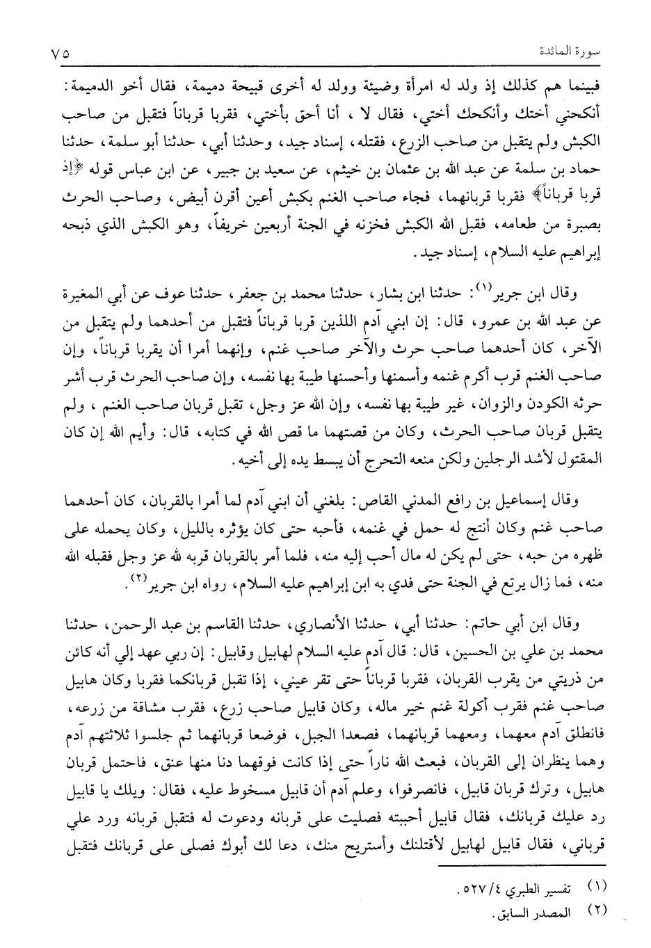 أَنْكِحْنِي أُخْتَكَ وأنكحك أختي، فقال لَا، أَنَا أَحَقُّ بِأُخْتِي، فَقَرَّبَا قُرْبَانًا فَتُقُبِّلَ مَنْ صَاحِبِ الْكَبْشِ وَلَمْ يُتَقَبَّلْ مِنْ صَاحِبِ الزَّرْعِ، فَقَتَلَهُ، إِسْنَادٌ جَيِّدٌ، وَحَدَّثَنَا أَبِي، حَدَّثَنَا أَبُو سَلَمَةَ، حَدَّثَنَا حَمَّادُ بْنُ سَلَمَةَ عَنْ عبد الله بن عثمان بن خيثم، عَنْ سَعِيدِ بْنِ جُبَيْرٍ، عَنِ ابْنِ عَبَّاسٍ قَوْلُهُ إِذْ قَرَّبا قُرْباناً فَقَرَّبَا قُرْبَانَهُمَا، فَجَاءَ صَاحِبُ الْغَنَمِ بِكَبْشٍ أَعْيَنَ أَقْرَنَ أَبْيَضَ، وَصَاحِبُ الحرث بصبرة من طعامه، فَقَبِلَ اللَّهُ الْكَبْشَ فَخَزَنَهُ فِي الْجَنَّةِ أَرْبَعِينَ خريفا، وهو الكبش الذي ذبحه إبراهيم عليه السلام، إِسْنَادٌ جَيِّدٌ.
