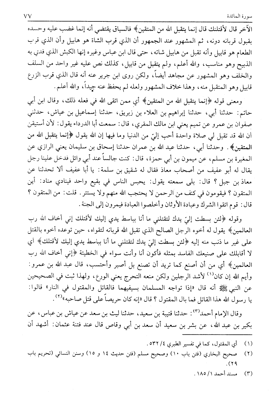 وَقَوْلُهُ لَئِنْ بَسَطْتَ إِلَيَّ يَدَكَ لِتَقْتُلَنِي مَا أَنَا بِباسِطٍ يَدِيَ إِلَيْكَ لِأَقْتُلَكَ إِنِّي أَخافُ اللَّهَ رَبَّ الْعالَمِينَ يَقُولُ لَهُ أَخُوهُ الرَّجُلُ الصَّالِحُ الَّذِي تَقَبَّلَ اللَّهُ قُرْبَانَهُ لِتَقْوَاهُ، حين توعده أَخُوهُ بِالْقَتْلِ عَلَى غَيْرِ مَا ذَنْبٍ مِنْهُ إِلَيْهِ لَئِنْ بَسَطْتَ إِلَيَّ يَدَكَ لِتَقْتُلَنِي مَا أَنَا بِباسِطٍ يَدِيَ إِلَيْكَ لِأَقْتُلَكَ أَيْ لَا أُقَابِلُكَ عَلَى صَنِيعِكَ الْفَاسِدِ بِمِثْلِهِ فَأَكُونُ أَنَا وَأَنْتَ سَوَاءٌ فِي الْخَطِيئَةِ إِنِّي أَخافُ اللَّهَ رَبَّ الْعالَمِينَ أَيْ مِنْ أَنْ أَصْنَعَ كَمَا تُرِيدُ أَنَّ تَصْنَعَ بَلْ أَصْبِرُ وَأَحْتَسِبُ، قَالَ عَبْدُ اللَّهِ بْنُ عَمْرٍو: