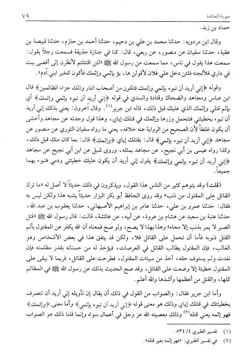 وَقَوْلُهُ إِنِّي أُرِيدُ أَنْ تَبُوءَ بِإِثْمِي وَإِثْمِكَ فَتَكُونَ مِنْ أَصْحابِ النَّارِ وَذلِكَ جَزاءُ الظَّالِمِينَ قَالَ ابْنُ عَبَّاسٍ وَمُجَاهِدٌ وَالضَّحَّاكُ وَقَتَادَةُ وَالسُّدِّيُّ فِي قَوْلِهِ إِنِّي أُرِيدُ أَنْ تَبُوءَ بِإِثْمِي وَإِثْمِكَ أَيْ بِإِثْمِ قَتْلِي وَإِثْمِكَ الَّذِي عَلَيْكَ قبل ذلك، قاله ابن جرير «1» . وقال آخرون: يعني بذلك أَنِّي أُرِيدُ أَنْ تَبُوءَ بِخَطِيئَتِي فَتَتَحَمَّلَ وِزْرَهَا وَإِثْمَكَ فِي قَتْلِكَ إِيَّايَ، وَهَذَا قَوْلٌ وَجَدْتُهُ عَنْ مُجَاهِدٍ وَأَخْشَى أَنْ يَكُونَ غَلَطًا لِأَنَّ الصَّحِيحَ مِنَ الرِّوَايَةِ عَنْهُ خِلَافُهُ، يَعْنِي مَا رَوَاهُ سُفْيَانُ الثَّوْرِيُّ عَنْ مَنْصُورٍ عَنْ مُجَاهِدٍ إِنِّي أُرِيدُ أَنْ تَبُوءَ بِإِثْمِي قَالَ: بِقَتْلِكَ إِيَّايَ وَإِثْمِكَ قَالَ: بِمَا كَانَ مِنْكَ قَبْلَ ذلك، وكذا رواه عيسى بن أبي نجيح، عن مجاهد بمثله، وَرَوَى شِبْلٌ عَنِ ابْنِ أَبِي نَجِيحٍ عَنْ مُجَاهِدٍ إِنِّي أُرِيدُ أَنْ تَبُوءَ بِإِثْمِي وَإِثْمِكَ يَقُولُ إِنِّي أُرِيدُ أَنْ يَكُونَ عَلَيْكَ خَطِيئَتِي وَدَمِي فَتَبُوءَ بِهِمَا جَمِيعًا.