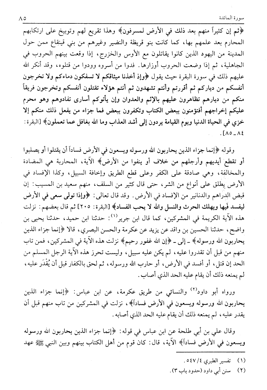 وقوله إِنَّما جَزاءُ الَّذِينَ يُحارِبُونَ اللَّهَ وَرَسُولَهُ وَيَسْعَوْنَ فِي الْأَرْضِ فَساداً أَنْ يُقَتَّلُوا أَوْ يُصَلَّبُوا أَوْ تُقَطَّعَ أَيْدِيهِمْ وَأَرْجُلُهُمْ مِنْ خِلافٍ أَوْ يُنْفَوْا مِنَ الْأَرْضِ الْآيَةَ، الْمُحَارِبَةُ هِيَ الْمُضَادَّةُ وَالْمُخَالِفَةُ، وَهِيَ صَادِقَةٌ عَلَى الْكُفْرِ وَعَلَى قَطْعِ الطَّرِيقِ وَإِخَافَةِ السَّبِيلِ، وَكَذَا الْإِفْسَادُ فِي الْأَرْضِ يُطْلَقُ عَلَى أَنْوَاعٍ مِنَ الشَّرِّ، حَتَّى قَالَ كَثِيرٌ مِنَ السَّلَفِ، مِنْهُمْ سَعِيدُ بْنُ الْمُسَيَّبِ: إن قبض الدَّرَاهِمِ وَالدَّنَانِيرِ مِنَ الْإِفْسَادِ فِي الْأَرْضِ. وَقَدْ قال تَعَالَى: وَإِذا تَوَلَّى سَعى فِي الْأَرْضِ لِيُفْسِدَ فِيها وَيُهْلِكَ الْحَرْثَ وَالنَّسْلَ وَاللَّهُ لَا يُحِبُّ الْفَسادَ [الْبَقَرَةِ: 205] ثُمَّ قَالَ بَعْضُهُمْ: نَزَلَتْ هَذِهِ الْآيَةُ الْكَرِيمَةُ فِي الْمُشْرِكِينَ، كَمَا قَالَ ابْنُ جَرِيرٍ «1» : حَدَّثَنَا ابْنُ حُمَيْدٍ، حَدَّثَنَا يَحْيَى بْنُ وَاضِحٍ، حَدَّثَنَا الْحُسَيْنُ بْنُ وَاقِدٍ عَنْ يَزِيدَ عن عكرمة والحسن البصري، قالا إِنَّما جَزاءُ الَّذِينَ يُحارِبُونَ اللَّهَ وَرَسُولَهُ- إِلَى- أَنَّ اللَّهَ غَفُورٌ رَحِيمٌ نَزَلَتْ هَذِهِ الْآيَةُ فِي الْمُشْرِكِينَ، فَمَنْ تَابَ مِنْهُمْ مَنْ قَبْلَ أَنْ تَقْدِرُوا عَلَيْهِ، لَمْ يَكُنْ عَلَيْهِ سَبِيلٌ، وَلَيْسَتْ تُحْرِزُ هَذِهِ الْآيَةُ الرَّجُلَ الْمُسْلِمَ مِنَ الْحَدِّ إِنْ قَتَلَ، أَوْ أَفْسَدَ فِي الْأَرْضِ، أَوْ حَارَبَ اللَّهَ وَرَسُولَهُ، ثُمَّ لَحِقَ بِالْكُفَّارِ قَبْلَ أَنْ يَقْدِرَ عَلَيْهِ، لَمْ يَمْنَعْهُ ذَلِكَ أَنْ يُقَامَ عَلَيْهِ الْحَدُّ الَّذِي أَصَابَ.