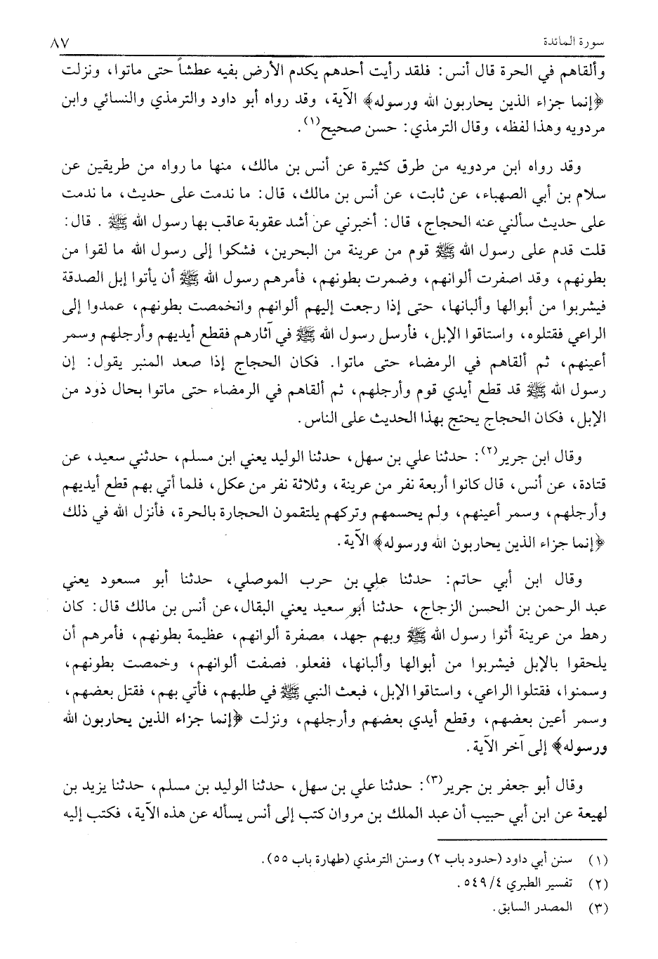 وَقَالَ ابْنُ جَرِيرٍ «2» : حَدَّثَنَا عَلِيُّ بْنُ سَهْلٍ، حَدَّثَنَا الْوَلِيدُ يَعْنِي ابْنَ مُسْلِمٍ، حَدَّثَنِي سَعِيدٌ، عَنْ قَتَادَةَ، عَنْ أَنَسٍ، قَالَ كَانُوا أَرْبَعَةَ نَفَرٍ مِنْ عُرَيْنَةَ، وَثَلَاثَةُ نَفَرٍ مِنْ عُكْلٍ، فَلَمَّا أُتِيَ بهم قطع أيديهم وأرجلهم، وسمر أعينهم، ولم يحسمهم وتركهم يلتقمون الْحِجَارَةَ بِالْحَرَّةِ، فَأَنْزَلَ اللَّهُ فِي ذَلِكَ إِنَّما جَزاءُ الَّذِينَ يُحارِبُونَ اللَّهَ وَرَسُولَهُ الْآيَةَ.