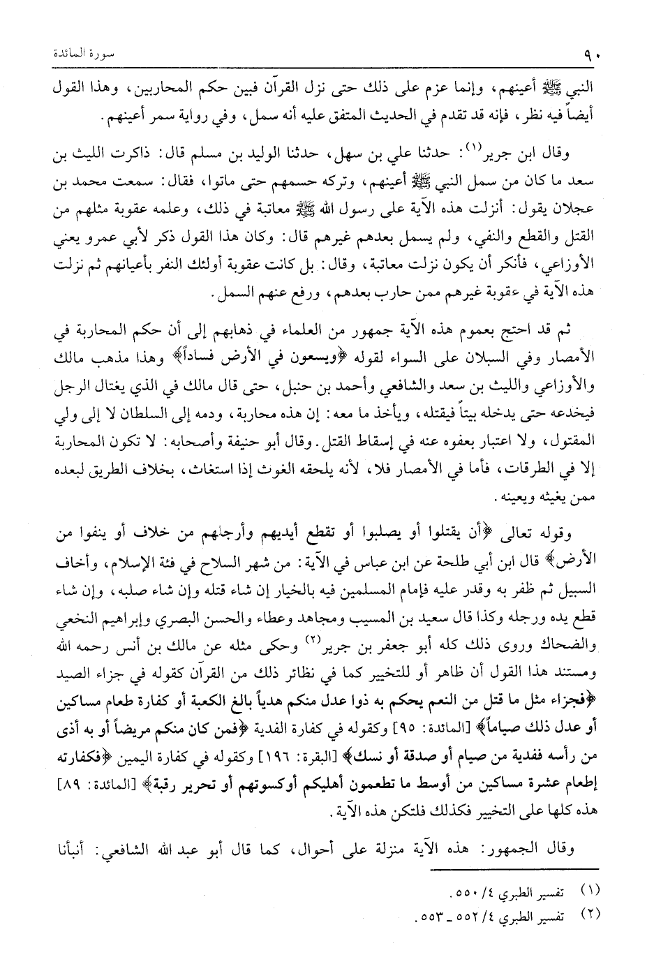 وقوله تعالى أَنْ يُقَتَّلُوا أَوْ يُصَلَّبُوا أَوْ تُقَطَّعَ أَيْدِيهِمْ وَأَرْجُلُهُمْ مِنْ خِلافٍ أَوْ يُنْفَوْا مِنَ الْأَرْضِ قَالَ ابْنُ أَبِي طَلْحَةَ عَنِ ابْنِ عَبَّاسٍ فِي الآية: من شهر السلاح في فئة الْإِسْلَامِ، وَأَخَافُ السَّبِيلَ ثُمَّ ظُفِرَ بِهِ وَقُدِرَ عَلَيْهِ فَإِمَامُ الْمُسْلِمِينَ فِيهِ بِالْخِيَارِ إِنْ شَاءَ قَتَلَهُ وَإِنْ شَاءَ صُلَبَهُ، وَإِنْ شَاءَ قَطَعَ يَدَهُ وَرِجْلَهُ وَكَذَا قَالَ سَعِيدُ بْنُ الْمُسَيَّبِ وَمُجَاهِدٌ وَعَطَاءٌ وَالْحَسَنُ الْبَصْرِيُّ وَإِبْرَاهِيمُ النَّخَعِيُّ وَالضَّحَّاكُ وَرَوَى ذَلِكَ كُلَّهُ أَبُو جَعْفَرِ بْنُ جَرِيرٍ «2» وَحُكِيَ مِثْلُهُ عَنْ مَالِكِ بْنِ أَنَسٍ رَحِمَهُ اللَّهُ وَمُسْتَنَدُ هَذَا الْقَوْلِ أَنَّ ظَاهِرَ أَوْ لِلتَّخْيِيرِ كَمَا فِي نَظَائِرِ ذَلِكَ مِنَ الْقُرْآنِ كَقَوْلِهِ فِي جَزَاءِ الصَّيْدِ فَجَزاءٌ مِثْلُ مَا قَتَلَ مِنَ النَّعَمِ يَحْكُمُ بِهِ ذَوا عَدْلٍ مِنْكُمْ هَدْياً بالِغَ الْكَعْبَةِ أَوْ كَفَّارَةٌ طَعامُ مَساكِينَ أَوْ عَدْلُ ذلِكَ صِياماً [المائدة: 95] وكقوله في كفارة الفدية فَمَنْ كانَ مِنْكُمْ مَرِيضاً أَوْ بِهِ أَذىً مِنْ رَأْسِهِ فَفِدْيَةٌ مِنْ صِيامٍ أَوْ صَدَقَةٍ أَوْ نُسُكٍ [الْبَقَرَةِ: 196] وَكَقَوْلِهِ فِي كَفَّارَةِ الْيَمِينِ فَكَفَّارَتُهُ إِطْعامُ عَشَرَةِ مَساكِينَ مِنْ أَوْسَطِ مَا تُطْعِمُونَ أَهْلِيكُمْ أَوْ كِسْوَتُهُمْ أَوْ تَحْرِيرُ رَقَبَةٍ [المائدة: 89] هَذِهِ كُلُّهَا عَلَى التَّخْيِيرِ فَكَذَلِكَ فَلْتَكُنْ هَذِهِ الْآيَةُ.