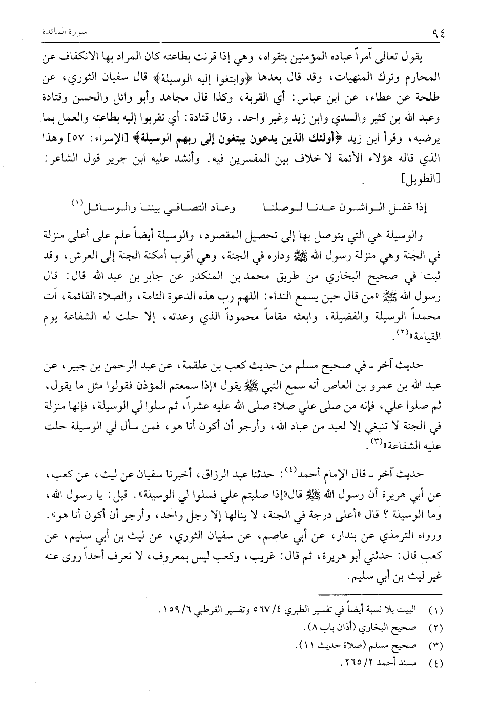 وَالْوَسِيلَةُ هِيَ الَّتِي يُتَوَصَّلُ بِهَا إِلَى تَحْصِيلِ الْمَقْصُودِ، وَالْوَسِيلَةُ أَيْضًا عَلَمٌ عَلَى أَعْلَى مَنْزِلَةٍ فِي الْجَنَّةِ وَهِيَ مَنْزِلَةُ رَسُولِ اللَّهِ صَلَّى اللَّهُ عَلَيْهِ وَسَلَّمَ وَدَارُهُ فِي الْجَنَّةِ، وَهِيَ أَقْرَبُ أَمْكِنَةِ الْجَنَّةِ إِلَى الْعَرْشِ، وَقَدْ ثَبَتَ فِي صَحِيحِ الْبُخَارِيِّ مِنْ طَرِيقِ مُحَمَّدِ بْنِ الْمُنْكَدِرِ عَنْ جَابِرِ بْنِ عَبْدِ اللَّهِ قَالَ: قَالَ رَسُولُ اللَّهِ صَلَّى اللَّهُ عَلَيْهِ وَسَلَّمَ «مَنْ قَالَ حِينَ يَسْمَعُ النِّدَاءَ: اللَّهُمَّ رَبَّ هَذِهِ الدَّعْوَةِ التَّامَّةِ، وَالصَّلَاةِ الْقَائِمَةِ، آتِ مُحَمَّدًا الْوَسِيلَةَ وَالْفَضِيلَةَ، وَابْعَثْهُ مَقَامًا مَحْمُودًا الَّذِي وَعَدْتَهُ، إلا حلت له الشفاعة يوم الْقِيَامَةِ» «2» .