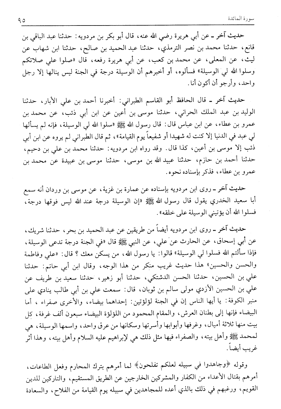 حَدِيثٌ آخَرُ- رَوَى ابْنُ مَرْدَوَيْهِ بِإِسْنَادِهِ عَنْ عُمَارَةَ بْنِ غَزِيَّةَ، عَنْ مُوسَى بْنِ وَرْدَانِ أَنَّهُ سَمِعَ أَبَا سَعِيدٍ الْخُدْرِيَّ يَقُولُ قَالَ رَسُولُ اللَّهِ صَلَّى اللَّهُ عَلَيْهِ وَسَلَّمَ «إِنَّ الْوَسِيلَةَ دَرَجَةٌ عِنْدَ اللَّهِ لَيْسَ فَوْقَهَا دَرَجَةٌ، فَسَلُوا اللَّهَ أَنْ يُؤْتِيَنِي الْوَسِيلَةَ عَلَى خَلْقِهِ» .