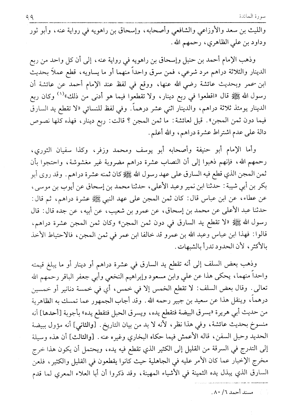 وَذَهَبَ بَعْضُ السَّلَفِ إِلَى أَنَّهُ تُقْطَعُ يَدُ السَّارِقِ فِي عَشَرَةِ دَرَاهِمَ أَوْ دِينَارٍ أَوْ مَا يَبْلُغُ قِيمُتُهُ وَاحِدًا مِنْهُمَا، يُحْكَى هَذَا عَنْ عَلِيٍّ وَابْنِ مَسْعُودٍ وَإِبْرَاهِيمَ النَّخَعِيِّ وَأَبِي جَعْفَرٍ الْبَاقِرِ رَحِمَهُمُ اللَّهُ تَعَالَى. وَقَالَ بَعْضُ السَّلَفِ: لَا تُقْطَعُ الْخَمْسُ إِلَّا فِي خَمْسٍ، أَيْ فِي خَمْسَةِ دَنَانِيرَ أَوْ خَمْسِينَ دِرْهَمًا، وَيُنْقُلُ هَذَا عَنْ سَعِيدِ بْنِ جُبَيْرٍ رَحِمَهُ اللَّهُ. وَقَدْ أَجَابَ الْجُمْهُورُ عَمَّا تَمَسَّكَ بِهِ الظَّاهِرِيَّةُ مِنْ حَدِيثِ أَبِي هُرَيْرَةَ «يَسْرِقُ الْبَيْضَةَ فَتُقْطَعُ يَدُهُ، وَيَسْرِقُ الْحَبْلَ فَتُقْطَعُ يَدُهُ» بِأَجْوِبَةٍ [أَحَدُهَا] أَنَّهُ مَنْسُوخٌ بِحَدِيثِ عَائِشَةَ، وَفِي هَذَا نَظَرٌ، لِأَنَّهُ لَا بُدَّ مِنْ بَيَانِ التَّارِيخِ. [وَالثَّانِي] أَنَّهُ مُؤَوَّلٌ بِبَيْضَةِ الْحَدِيدِ وَحَبْلِ السُّفُنِ، قَالَهُ الْأَعْمَشُ فِيمَا حَكَاهُ الْبُخَارِيُّ وَغَيْرُهُ عنه. [والثالث] أن هذه وَسِيلَةٌ إِلَى التَّدَرُّجِ فِي السَّرِقَةِ مِنَ الْقَلِيلِ إِلَى الْكَثِيرِ الَّذِي تُقْطَعُ فِيهِ يَدُهُ، وَيُحْتَمَلُ أَنْ يَكُونَ هَذَا خَرَجَ مَخْرَجَ الْإِخْبَارِ عَمَّا كَانَ الْأَمْرُ عَلَيْهِ فِي الْجَاهِلِيَّةِ حَيْثُ كَانُوا يَقْطَعُونَ فِي الْقَلِيلِ وَالْكَثِيرِ، فَلَعَنَ السَّارِقَ الَّذِي يَبْذُلُ يَدَهُ الثَّمِينَةَ فِي الْأَشْيَاءِ الْمَهِينَةِ، وَقَدْ ذَكَرُوا أَنَّ أَبَا الْعَلَاءِ الْمَعَرِّيَّ لَمَّا قَدِمَ