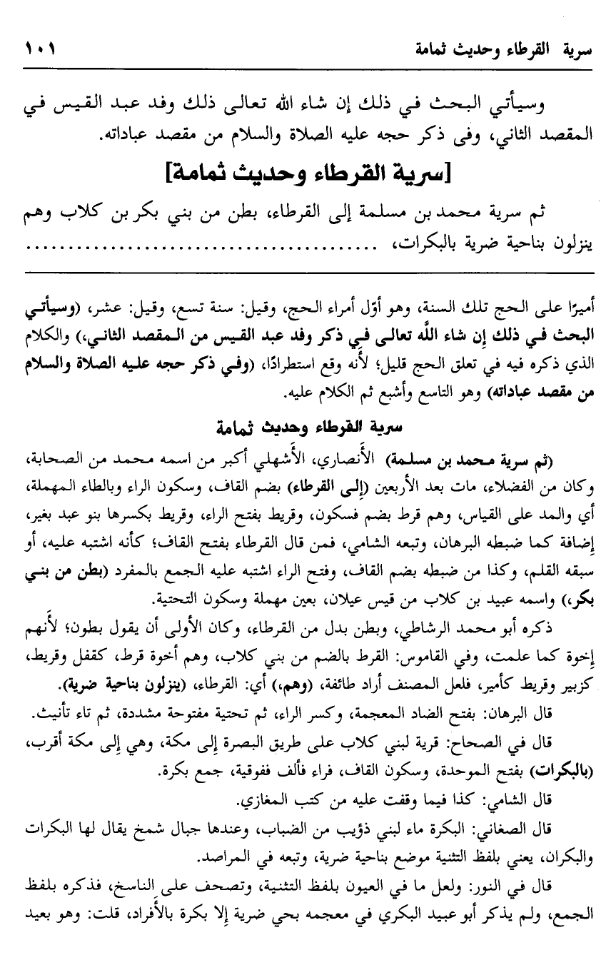 "ثم سرية محمد بن مسلمة" الأنصاري، الأشهلي أكبر من اسمه محمد من الصحابة، وكان من الفضلاء، مات بعد الأربعين "إلى القرمطاء" بضم القاف، وسكون الراء وبالطاء المهملة, أي: والمد على القياس، وهم قرط بضم فسكون، وقريط بفتح الراء، وقريط بكسرها بنو عبد بغير، إضافة كما ضبطه البرهان، وتبعه الشامي، فمن قال القرطاء بفتح القاف، كأنه اشتبه عليه، أو سبقه القلم، وكذا من ضبطه بضم القاف، وفتح الراء اشتبه عليه الجمع بالمفرد "بطن من بني بكر،" واسمه عبيد بن كلاب من قيس عيلان، بعين مهملة وسكون التحتية.