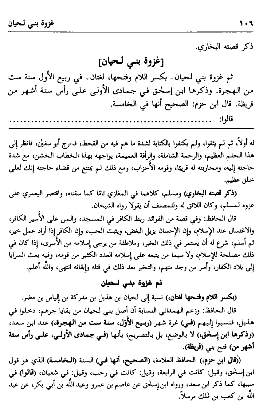 قال الحافظ: وزعم الهمداني النسابة أن أصل بني لحيان من بقايا جرهم، دخلوا في هذيل، فنسبوا إليهم "في" غرة شهر "ربيع الأول، سنة ست من الهجرة" عند ابن سعد، "وذكرها ابن إسحاق" لا بالوضع، بل بالتصريح، بأنها "في جمادى الأولى، على رأس ستة أشهر من" فتح بني "قريظة".