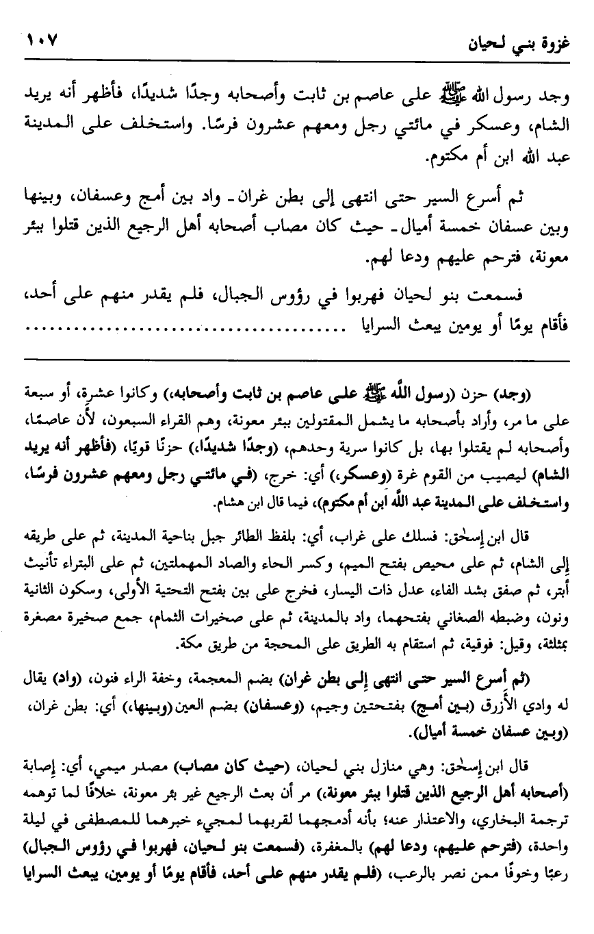 قال ابن إسحاق: وهي منازل بني لحيان، "حيث كان مصاب" مصدر ميمي، أي: إصابة "أصحابه أهل الرجيع الذين قتلوا ببئر معونة"، مر أن بعث الرجيع غير بئر معونة، خلافا لما توهمه ترجمة البخاري، والاعتذار عنه، بأنه أدمجهما لقربهما لمجيء خبرهما للمصطفى في ليلة واحة "فترحم عليهم، ودعا لهم" بالمغفرة "فسمعت بنو لحيان، فهربوا في رءوس الجبال" رعبا وخوفا ممن نصر بالرعب، "فلم يقدر منهم على أحد، فأقام يوما أو يومين، يبعث السرايا