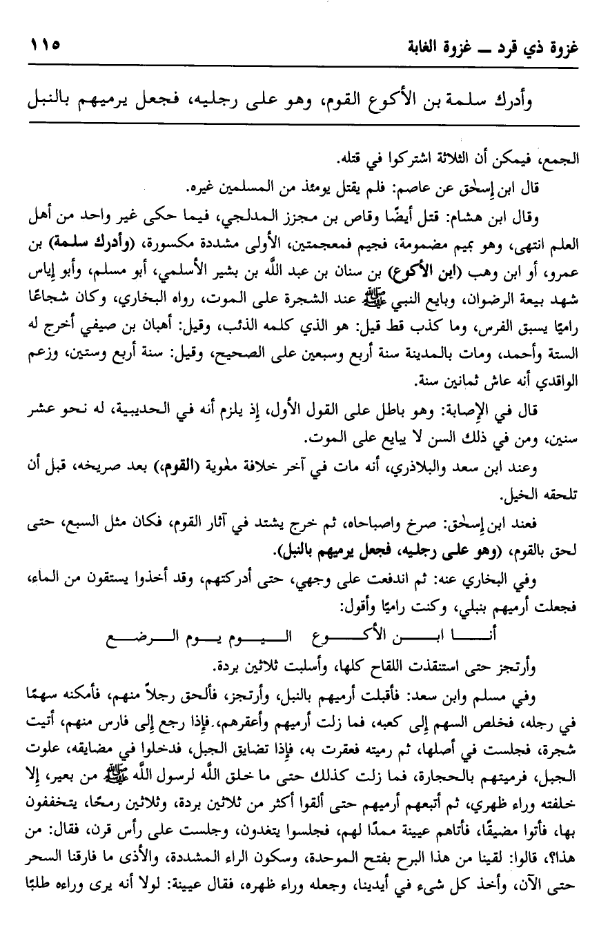 وأدرك سلمة بن الأكوع القوم، وهو على رجليه، فجعل يرميهم بالنبل