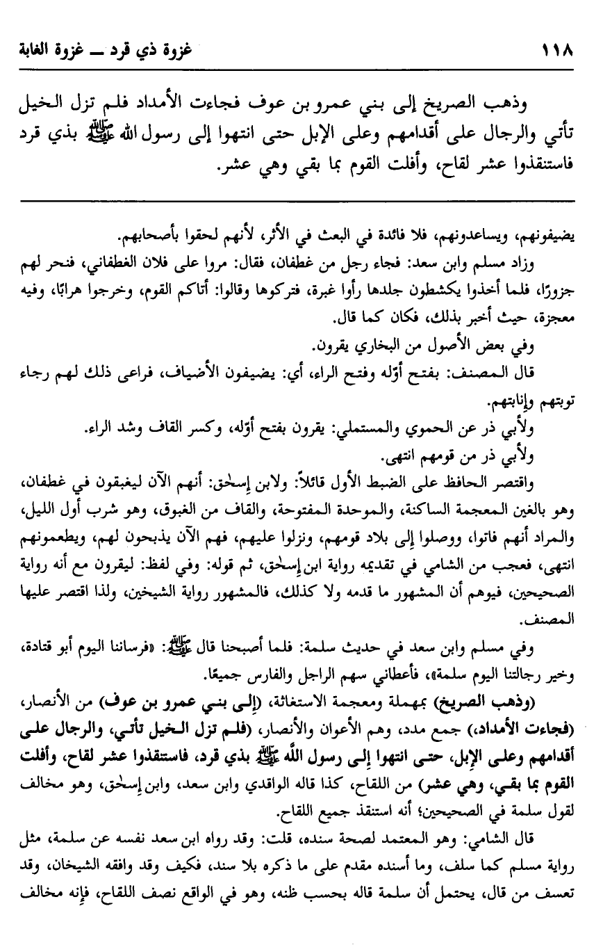"وذهب الصريخ" بمهملة ومعجمة الاستغاثة، "إلى بني عمرو بن عوف" من الأنصار، "فجاءت الأمداد" جمع مدد، وهم الأعوان والأنصار "فلم تزل الخيل تأتي، والرجال على أقدامهم وعلى الإبل، حتى انتهوا إلى رسول الله صلى الله عليه وسلم بذي قرد، فاستنقذوا عشر لقاح، وأفلت القوم بما بقي، وهي عشر" من اللقاح، كذا قاله الواقدي وابن سعد، وابن إسحاق، وهو مخالف لقول سلمة في الصحيحين، أنه استنقذ جميع اللاح.