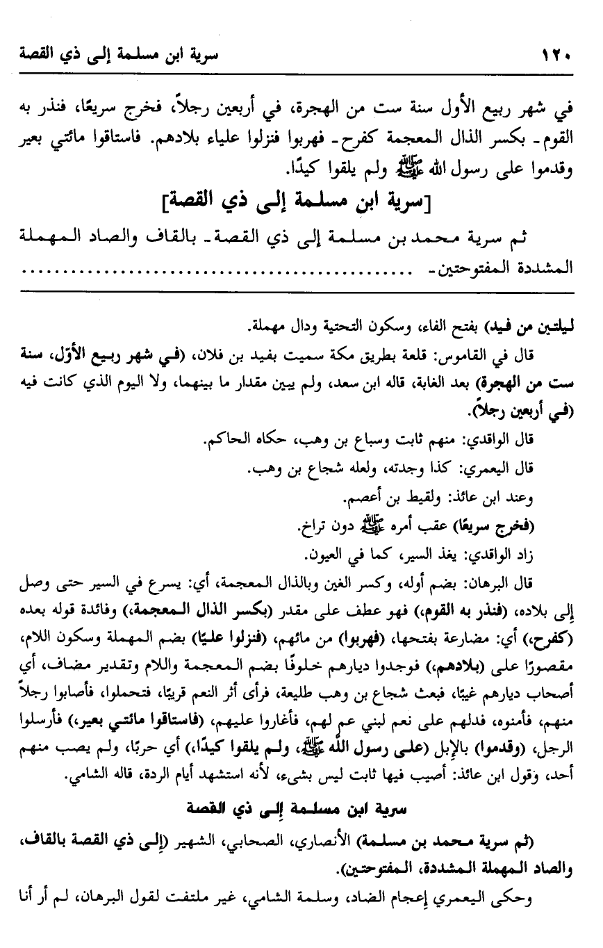 "ثم سرية محمد بن مسلمة" الأنصاري، الصحابي، الشهير "إلى ذي القصة بالقاف، والصاد المهملة المشددة، المفتوحتين".