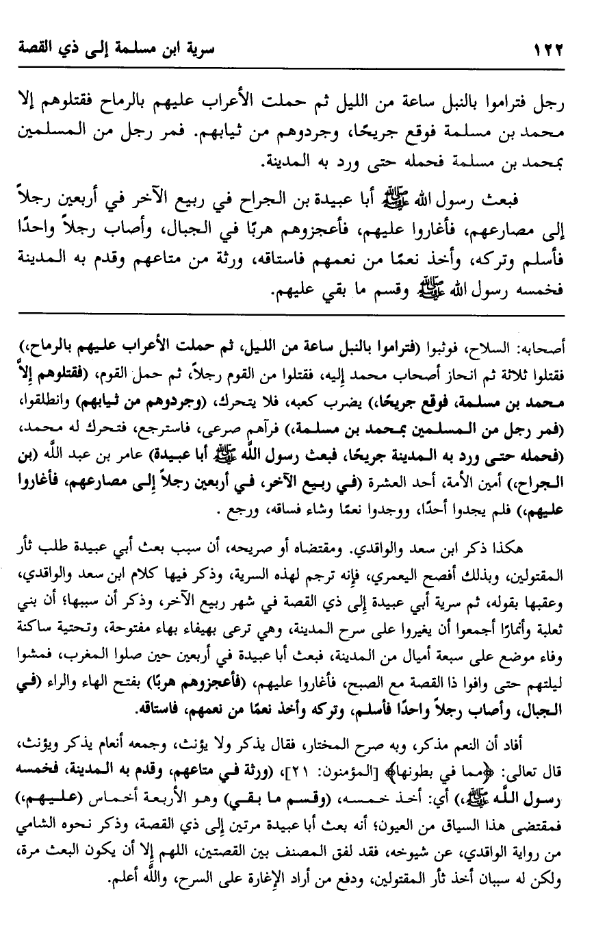 أصحابه: السلاح، فوثبوا "فتراموا بالنبل ساعة من الليل، ثم حملت الأعراب عليهم بالرماح"، فقتلوا ثلاثة ثم انحاز أصحاب محمد إليه، فقتلوا من القوم رجلا، ثم حمل القوم، "فقتلوهم إلا محمد بن سلمة، فوقع جريحا" يضرب كعبه، فلا يتحرك "وجردوهم من ثيابهم" وانطلقوا، "فمر رجل من المسلمين بمحمد بن مسلمة"، فرآهم صرعى، فاسترجع، فتحرك له محمد، "فحمله حتى ورد به المدينة جريحا، فبعث رسول الله صلى الله عليه وسلم أبا عبيدة" عامر بن عبد الله "بن الجراح" أمين الأمة، أحد العشرة "في ربيع الآخر، في أربعين رجلا إلى مصارعهم، فأغاروا عليهم" فلم يجدوا أحدا، ووجدوا نعما وشاء فساقه، ورجع.